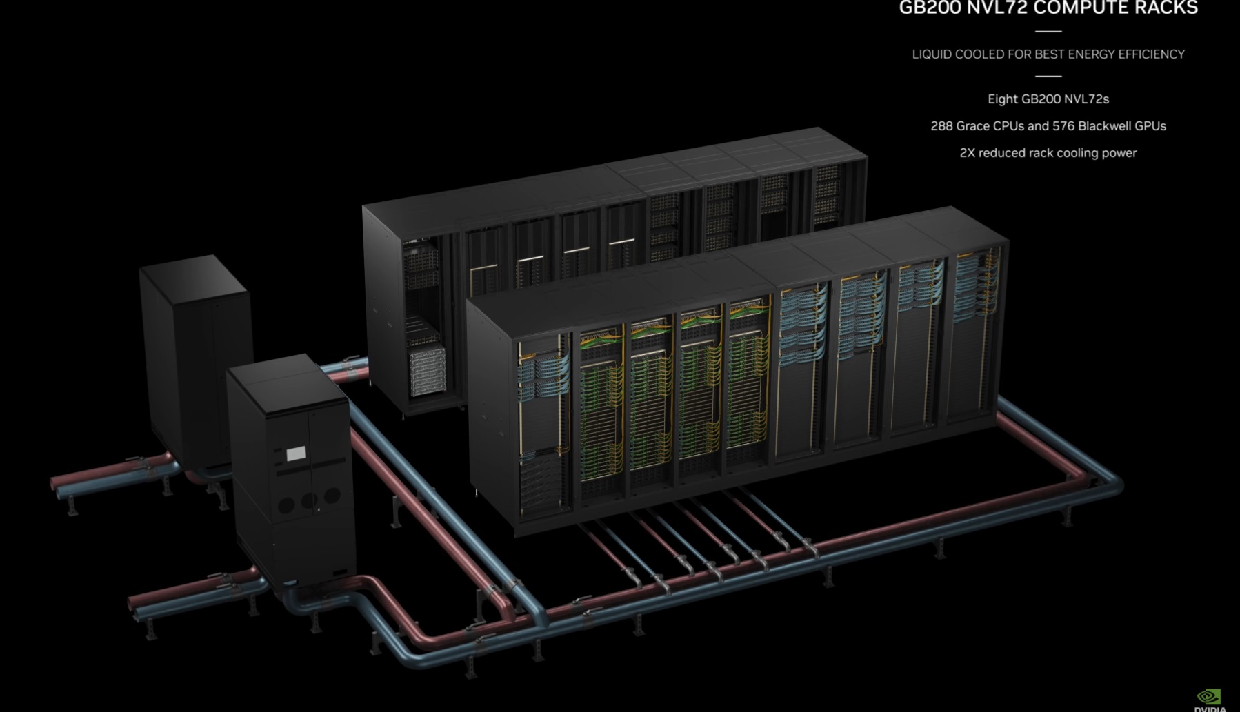 まずは最初にこの写真を見て貰いたい。これはエヌビディアがGTC2024で発表した新しいGPUことBlackwell B200を搭載したDGX Super Podの写真。お気づきだと思うが、サーバーラックの周りに赤と青のパイプがある。実はこれこそが液冷ユニットなのだ。これを補完するように「新たに高効率な液冷ラックスケール アーキテクチャを特徴とする新しい DGX SuperPOD は、NVIDIA DGX™ GB200 システムで構築され・・・」という説明がエヌビディアのWebサイト上でも確認出来る。