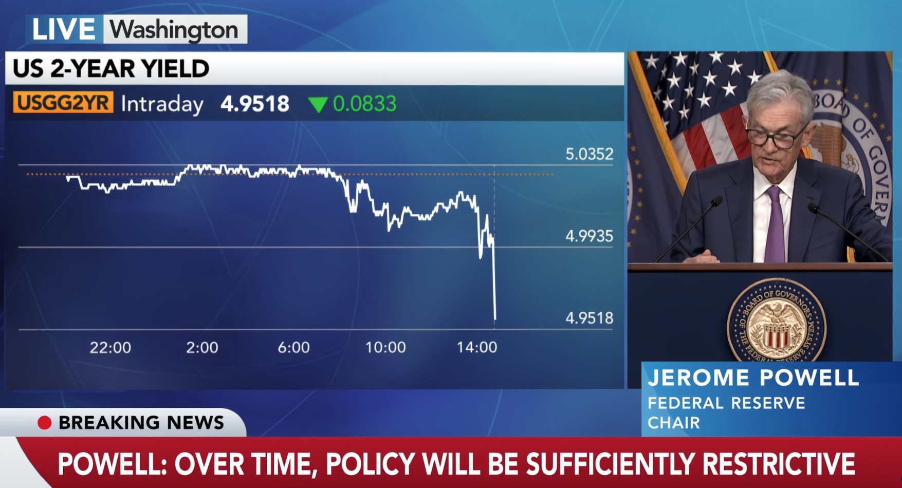 ご参考までに、これが記者会見開始直後の米国2年債の動きと、そのタイミングでのパウエル議長の発言。画面がリアルタイムのLIVE放送と、その状況を伝えるBloombergのWeb放送だ。誰でも無料で観れるから、是非とも、機会があれば参考にしてみると良いだろう。※但し、LIVE放送を観るには、夏時間の時で、日本時間では午前3時半からの開始となる。「Breaking News」と表示されている部分「Over time, Policy will be sufficiently restrictive.(時間が経つにつれて、ポリシーは十分に制限的になるでしょう。)」というのが、パウエル議長の正式見解だ。少なくとも、政策金利に連動し易い期間の短い2年債金利は一気に低下したのがわかる。