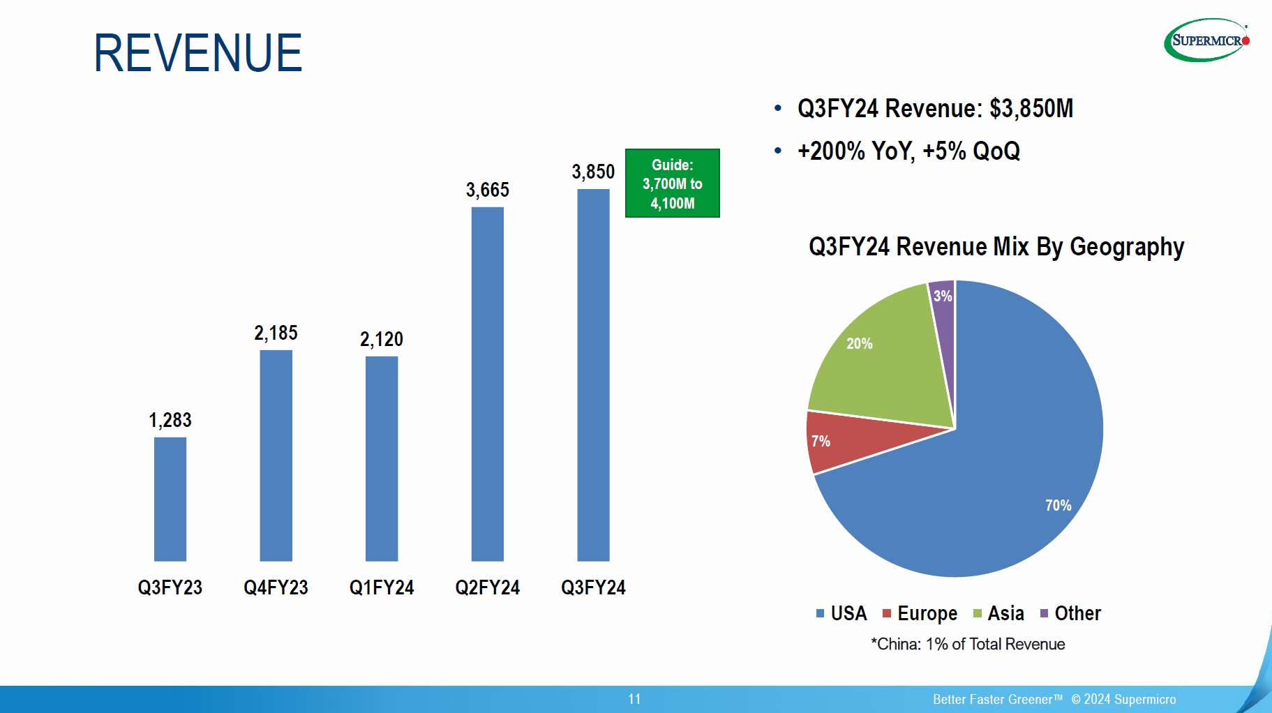 だが、市場が最も気にした点、そして私も資料を見て同意してしまうのは、Q3FY24の対前四半期比の伸び率が鈍化しいるように見えること。確かに対前年比で比べれば+200%だが、対前期比では+5%となっている。四半期毎には季節性があるので、対前年比で比較するのが重要と他の銘柄ではお伝えしてきているが、この銘柄に関しては、突然檜舞台に飛び出てきたということもあり、それが継続性のあるトレンドなのか、瞬間値なのかは確りと確認する必要がある。下記のスライドが同社が決算説明に使ったスライドだ。