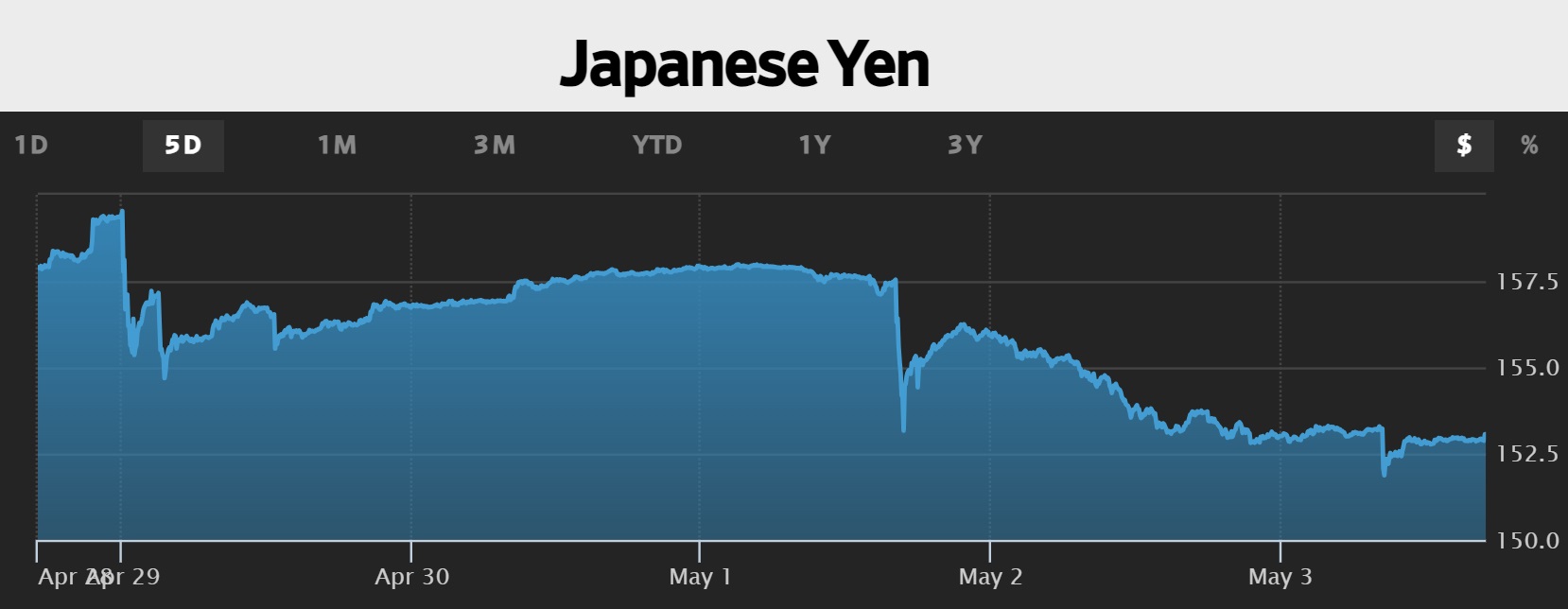 前回GW中の隙間で「鬼の居ぬ間に・・・」と投機筋が仕掛けるかと思っていたが、実際には逆に金融当局の方が為替介入を行ったのはほぼ間違いない事実だ。最初が160円をつけた直後の29日。だが、初戦は引き分け感が強い。というのは、介入効果で一旦は円高に動いたものの、ジワジワと再び円は売られて元の木阿弥、少なくとも日銀の金融政策決定会合前後の水準にまでは自然体だと押し戻された。
