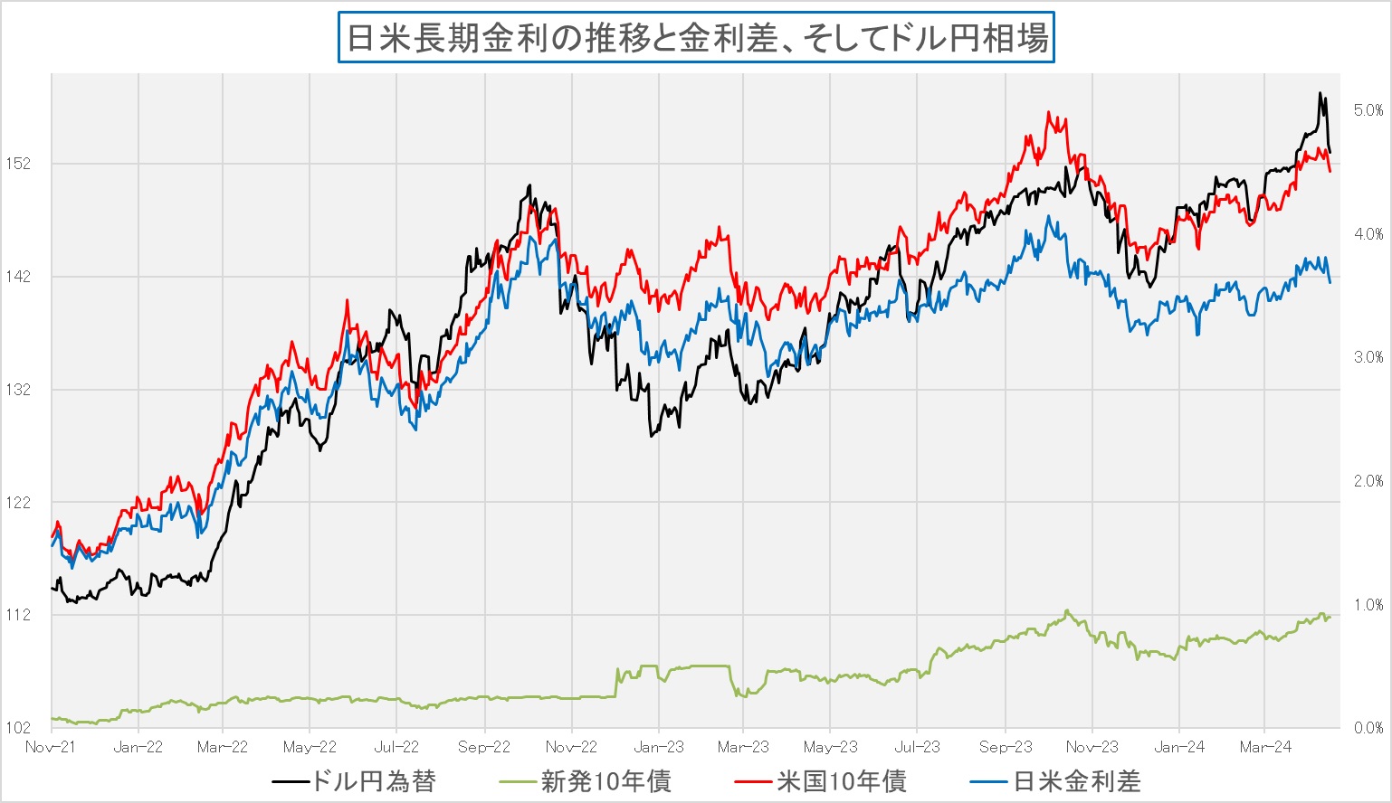 定性的に形容詞と副詞だけで解説すると、この見出しのように「米国金利は低下、日米金利差は縮小」ということになり、「やっぱり日銀が利上げしないと、円安は止まらない」というロジックが増えるだろう。ただ為替相場動向に限らず、株式市場についても、債券・金利市場についても同様に、数字を伴わない市場解説ぐらい、受け取る側の知識水準によって、その刷り込みはマチマチになるので気をつけた方が良い。私のようにように、常時マーケット水準をあれやこれやとモニターしている者にとっては、仮に「急」とか「爆」と言った文字がついたところで、その事実は正確に確認しているが、一般の人は違う筈だ。だからこそ、そこを狙って「アテンション・エコノミー」が上手につけ入るスキがあるのだが、下のチャートを見て頂きたい。黒い線がドル円相場、赤が米国10年債利回り、青が日米10年債利回りの金利差、そして緑が日本の10年債利回りだ。ご覧頂ける通り、確かに「米国金利は低下、日米金利差は縮小」に沿って、同じ方向にドル円相場のベクトルがあるのは確かだが、赤線の上の黒線の動き、明らかに直近で160円方向へオーバーシュートし、そして152円台に金利変動以上に動いたことがわかる。