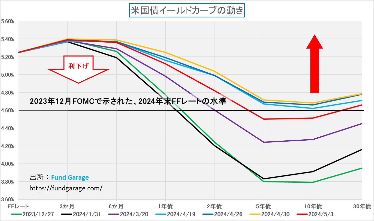 一方で、週央水曜日(1日)に発表になったFOMCの内容、これはそもそも予想するまでもなく「何も無いだろう」とお伝えしていたが、まさにその通りで終わった。利下げが6回もあると超楽観的な考えを言っていた論調を、あっという間に手のひら返しで「利上げもありか?」という超悲観論に変えていた投機筋が集まる「市場(実際はデリバティブ市場)」に対しては、明らかにパウエル議長は「違うよ」と釘を刺した。インフレは粘着質で、米国景気は底堅く力強いものの、利上げがあると予想する程ではないということを、次の表現ではっきりと明言された。すなわち「I think it’s unlikely that the next policy rate move will be a hike」ということだ。これで超悲観論は撃沈。ならば利下げ回数や利下げ幅の方についてのコメントがあったかと言えば、年末のFFレートの着地水準(現状4.6%)を動かすようなコメントも無かった。だが、実は「利下げ」という方法では無いが、「QT(国債の買い入れ償還による量的引締め)」の減額(月額600億ドルから月額250億ドルに引き下げ)が発表されたことは、明らかに金融緩和姿勢、少なくとも引締めスタンスの緩和であることを、メモして置いても罰は当たらない。