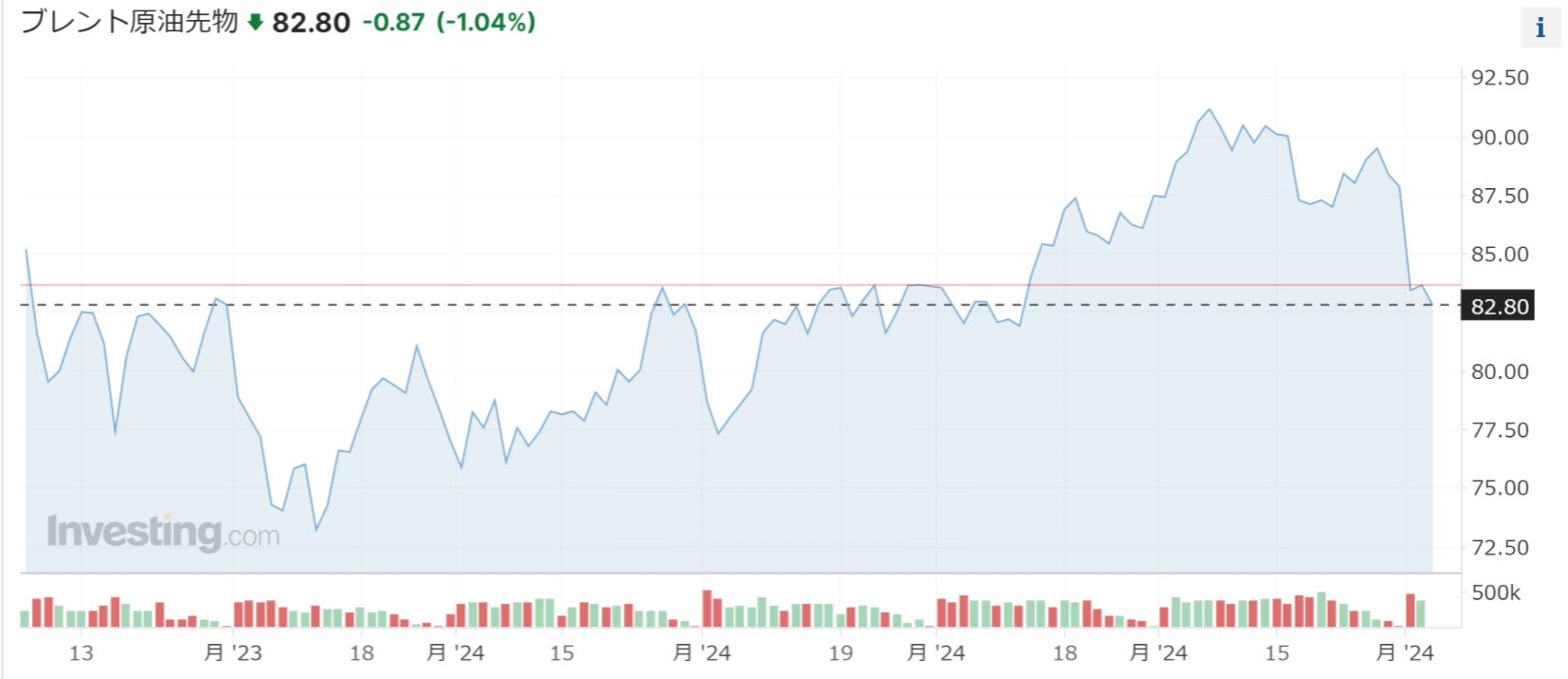 下記のチャートは米国中心のWTI原油先物ではなく、ブレント原油先物の方だ。ご覧頂ける通り、先週末の終値は82.80ドル。私が「たいしたことにはなら無さそうだ」と読んだのは、90ドル越えさえも僅かな期間で終わったことだ。ロシアがウクライナに侵攻した時は、あっという間に120ドル超にまで急騰した。因みに、先週末のWTI原油先物も78.11ドルにまで低下している。別に産油国が増産しているわけではない。