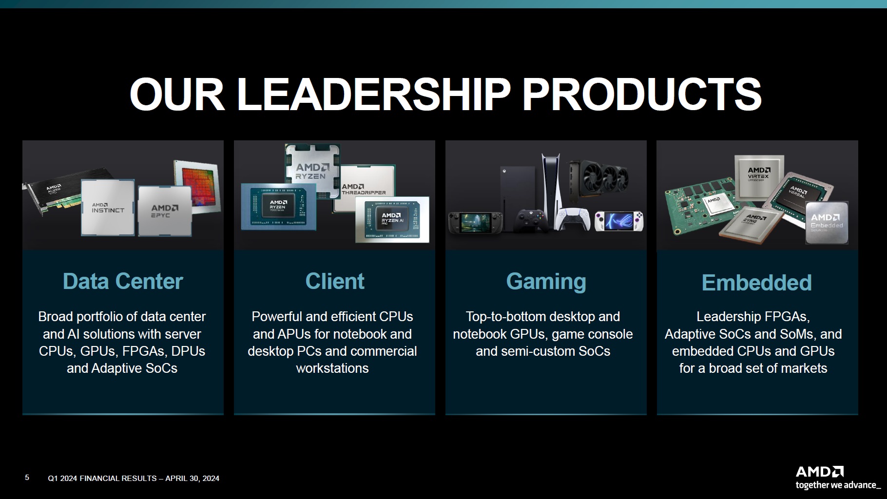 本来、だからこそ、AMDはしぶとく強いのだが、下記のスライドにある「リーダーシップ商品」を見て貰って、そのセグメント「Data Center」「Client」「Gaming」そして「Embedded」と4つのセグメント、それぞれについて何がどのフィールドで強みを持つか、どんなビジネストレンドの中にあるのかを把握するのは、簡単に超ザックリと要約したような決算報道からだけでは難しいだろう。ましてや単に「半導体企業」とだけ括っているような論説ならば尚更だ。