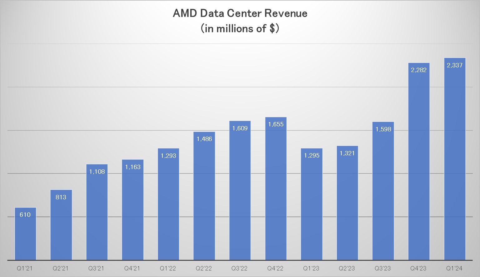 こうしたことを背景として、データセンターの 2024年のGPU 収益を、1 月に目標としていた 35 億ドルから 40 億ドルに上方修正した。ただ、この上方修正が市場の強気派の不興をかった。実は強気派は今年の目標が50億ドルを超えると踏んでいたので、何か製造プロセス(HBMの調達などやサブストレートの調達など)で供給制約があるのではと疑っているようだ。だがこれはAMD特有のガイダンスの慎重さが最大理由だろう。もうひとつ加えるとしたら、下記のチャートに見るように、四半期毎の伸び率が低下したようにも見えること。ただ、AMDのこのセグメントには、MI300のようなGPUだけではんく、サーバー用CPUのEpycなど、所謂コンベンショナルなサーバー向けCPUの売上も入っているということを考えておくべきだろう。MI300だけで、CY2024はひとまず40億ドルの見込みを立てている。この数字は直近の2四半期のデータセンタ・セグメント分にも相当する金額で、勿論、上方修正含みであることは言うまでもない。