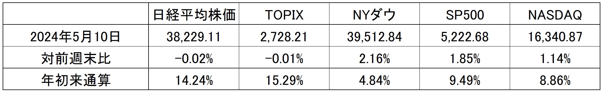 その一方で、下表でご覧頂ける通り、日本の時価総額最大企業であるトヨタ自動車の株価が週を通じて△3.87%の下落となったにもかかわらず、日本株の株価指数が対前週比でほぼ変わらずで着地しているのは、同社の時価変動の影響度が小さいからではない。ゴールデンウイーク中の米国市場の上昇分をひとまず週明けの寄付きで織り込み、例えば日経平均は週初に前週末比で600円幅で上昇し、それを結局一週間を通じて全て吐き出したというのが正しい理解となる。