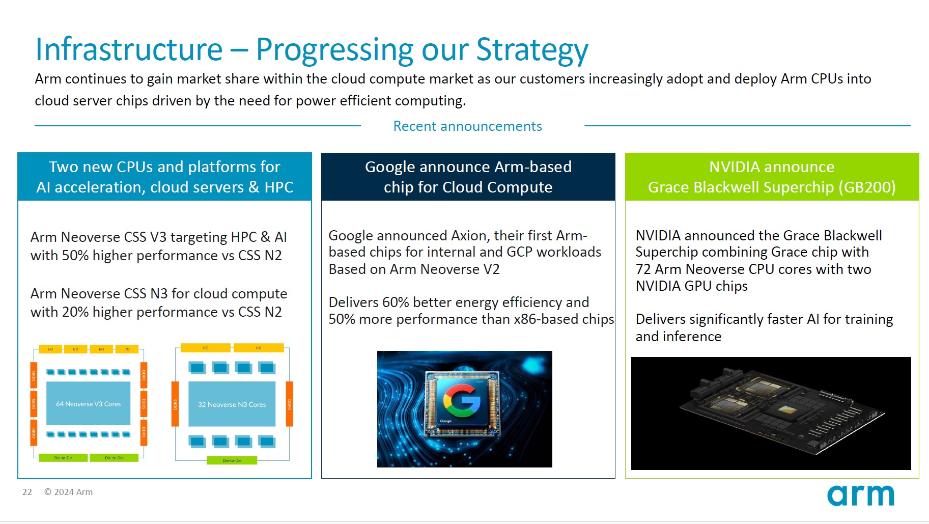その利用目的の中で、IPO プロセス中に ArmのレネCEOはエヌビディアのGrace Hopperのことを話しているが、それはエヌビディアの最新の発表である Grace Blackwell に採用され、これらの AI アプリケーションにおけるデータセンターの ARM の加速が見られる。 Grace Blackwell のようなチップの設計に関して得られる利点の 1 つは、ARM CPU を NVIDIA GPU と統合することで、CPU と GPU 間の相互接続を実現し、より高度なアクセスを可能にすること。メモリは、AIのトレーニングおよび推論アプリケーションの制限要因の 1 つで、x86アーキテクチャーに外部接続する従来方式のシステムでは、低速なPCI バス経由で接続する必要がある。だがBlackwellのようなNVLinkを使用した場合はメモリ帯域幅が大幅に向上する。つまり、データセンターでの ARM の採用が、おそらく以前示された数字よりも早く増加するということなどと、レネCEOは語っている。下のスライドの右側に、エヌビディアのGrace Blackwellのことが説明されている。