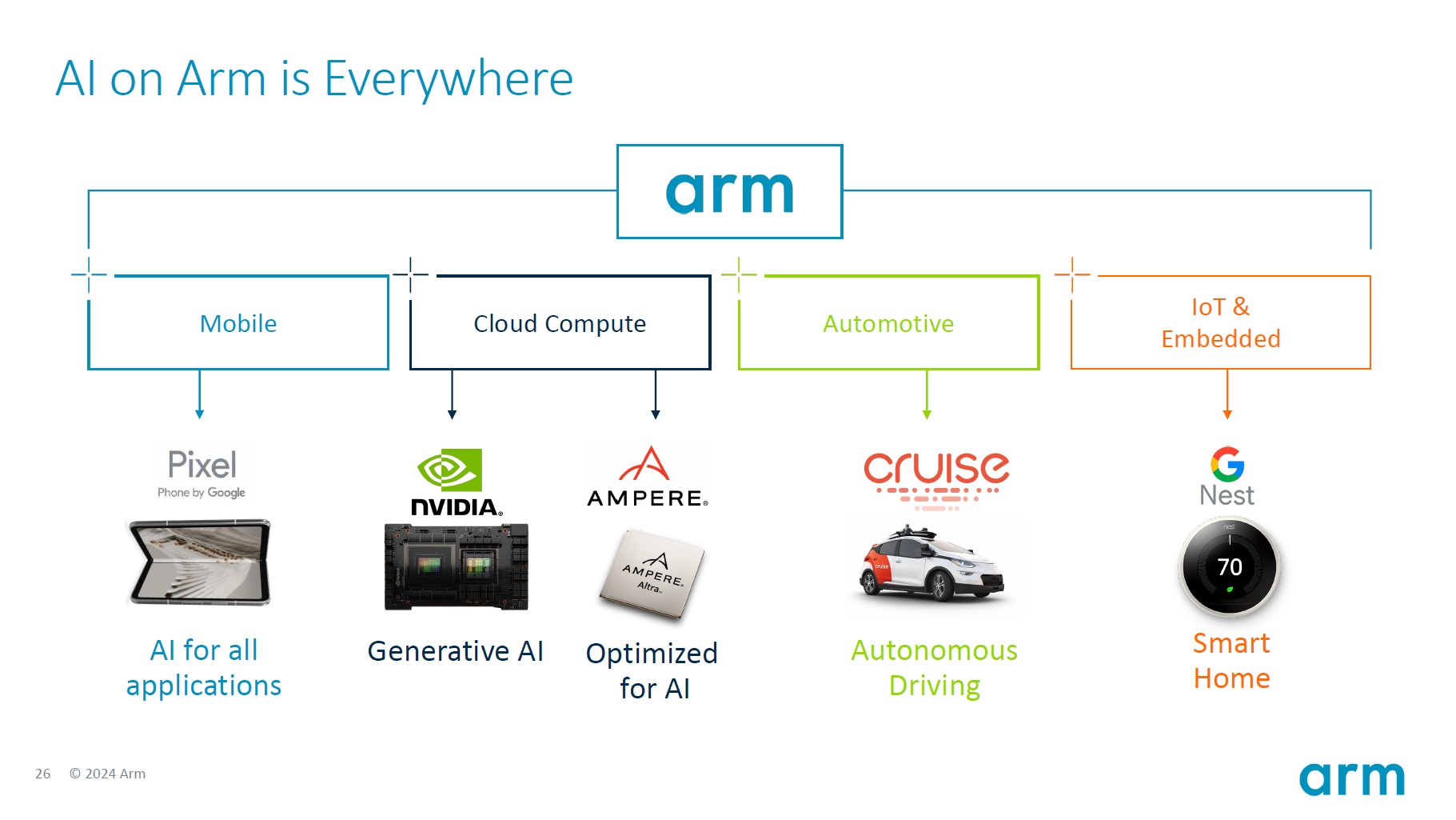 ならば何故、何にMr.Market(市場)は納得しなかったのかと言えば、やはり時間軸の問題だろうと推察する。下のスライド、「ArmのAIはあちらこちらに拡がる」といった意味のスライドになるが、さはさりながら、現時点で身近にありそうなものと言えば、Google Pixel(スマートフォン)のものぐらいかも知れない。勿論、Cloud Computeの分野のものは加速しているが、自動運転のサンプル画像のGMクルーズは、現状、やや躓いている。IoTなどの部分、これはAMDの例と同じことで、例えばSmart Homeは、まだまだその普及過程で、とてもとても成熟するタイミングが見えるような状況には遥かに遠い。だが間違ってはいけないのは、その時が来ない話をしているのではなく、着実に順番は回ってきているということ。