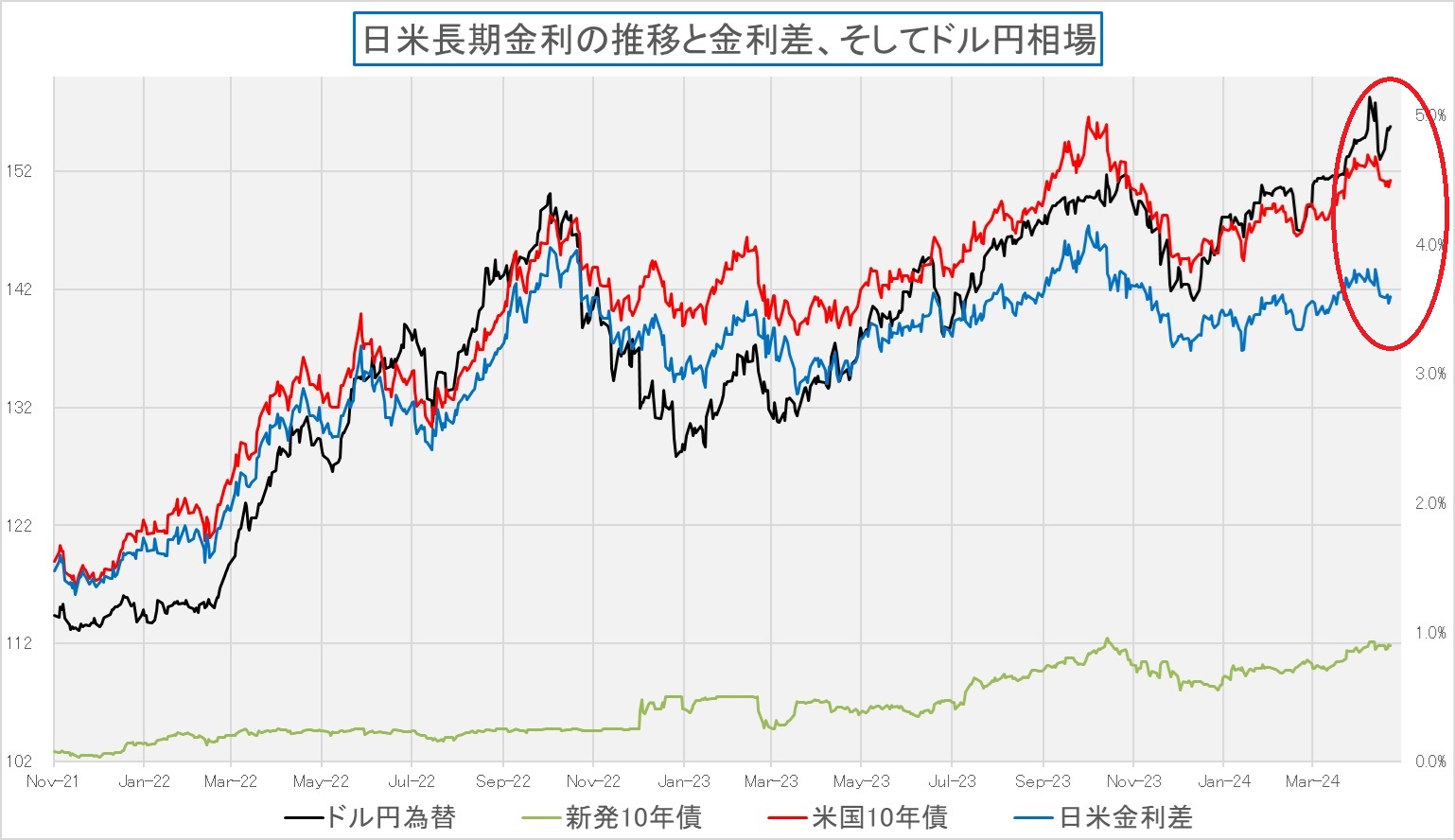 最近の為替相場は二度に亘って為替介入が行われたことも手伝い、従来以上に日米の金利差では動いていない。下のチャートの赤い丸で囲んだ部分、黒線がドル円相場、赤線が米国10年債利回り、その下の青い線が日米の金利差となる。赤い線で見るのがハッキリしているが、米国金利が低下したことで日米の金利差は縮小しても、為替は寧ろドル高・円安に動いている。円買いドル売り介入に2度も入った金融当局を、投機筋がせせら笑っているかのようだ。直近のドル円相場を専門用語を駆使して説明しようとする人も多いが、一番端的なポイントを捉えるならば、それは需給だろう。ただ、そんな難しいことを考えずとも、「自国民が自ら将来性を評価しない資産を、海外投資家がローカルに成り代わって買ってくれる道理はない」というだけだ。「幾ら高いお金を出しても、日本には行ってみる価値がある」とインバウンド需要が盛り上がっているわけではなく、「こんなに安く行けるのだから、日本に行かない手はない」と言うのが欧米からの旅行者の本音だ。