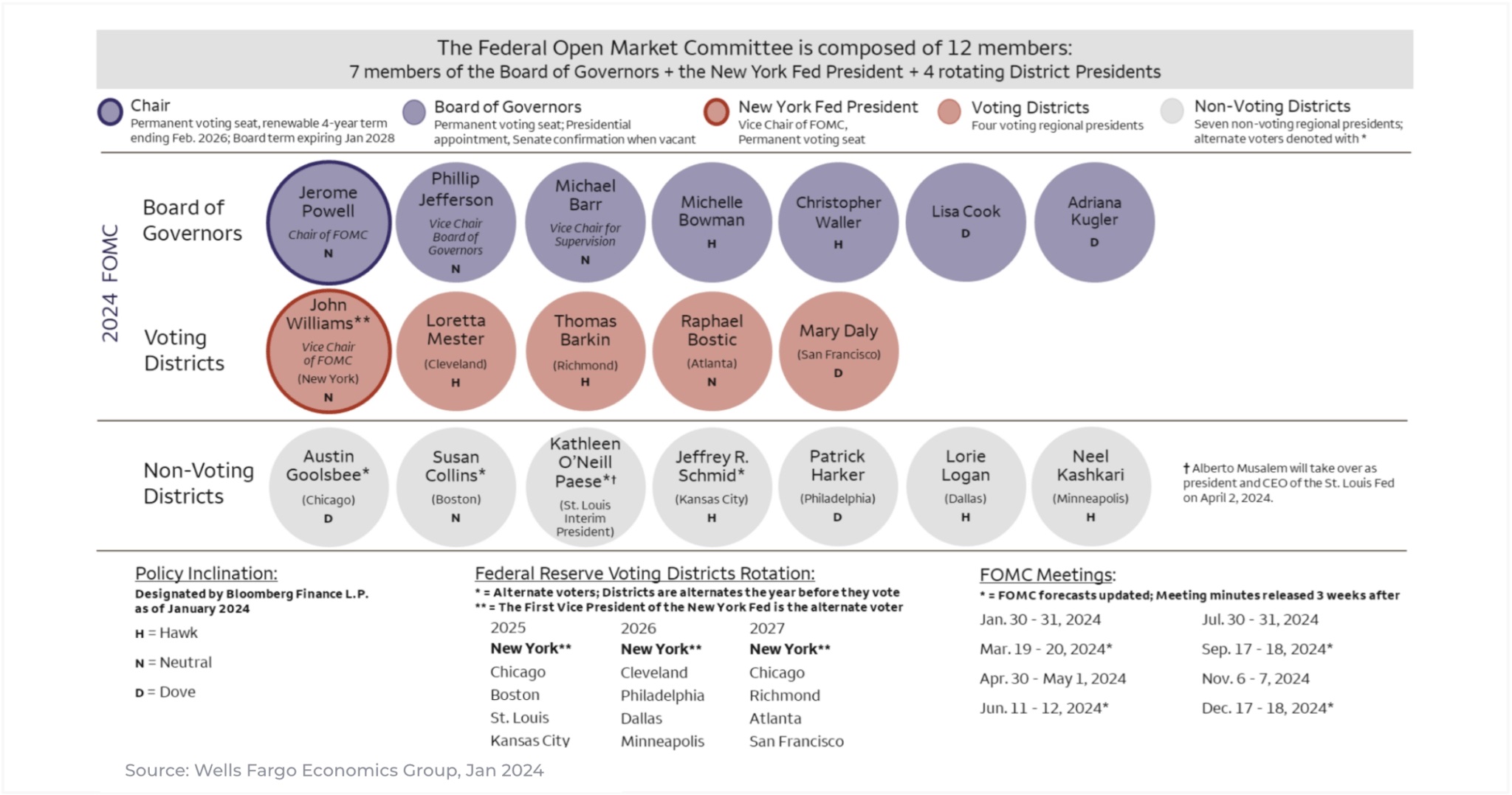 下記の図は、現在FOMCに投票権を持つ理事7名と、地区連銀総裁5名、更には投票権は無いがFOMCには参加する連銀総裁7名がタカ派(H)かハト派(D)か中立(N)かを示した図だ。今後も「FRBの○○○氏が○○○○な発言をして・・・」とあったら、この図を見て基本的なスタンスを確認して貰うと良いだろう。