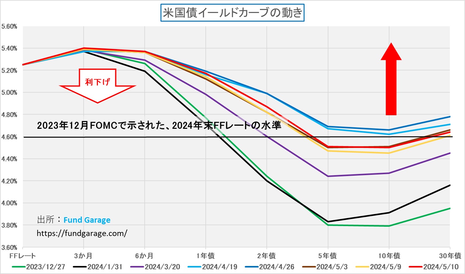 スタグフレーション(stagflation)とは、景気が後退しながら物価が上昇するという意味なので、容易に利下げしようにもインフレが妨害するという状況だが、少なくとも、足許では長期金利は低下している。すなわち、景気が後退している感じを実感しているということだ。確かに政策金利(短期金利)が下がれば良いのだが、状況としては、少なくとも債券市場の方はインフレの方を無視する形となっている。イールドカーブのチャートを添付するので、参照されたい。赤い線が先週末のイールドカーブだ。残念ながら、順イールドに戻るのは、まだ先になりそうなもの事実。でも、それでも日本円よりも米ドルが買われたというのが足元の真実だ。
