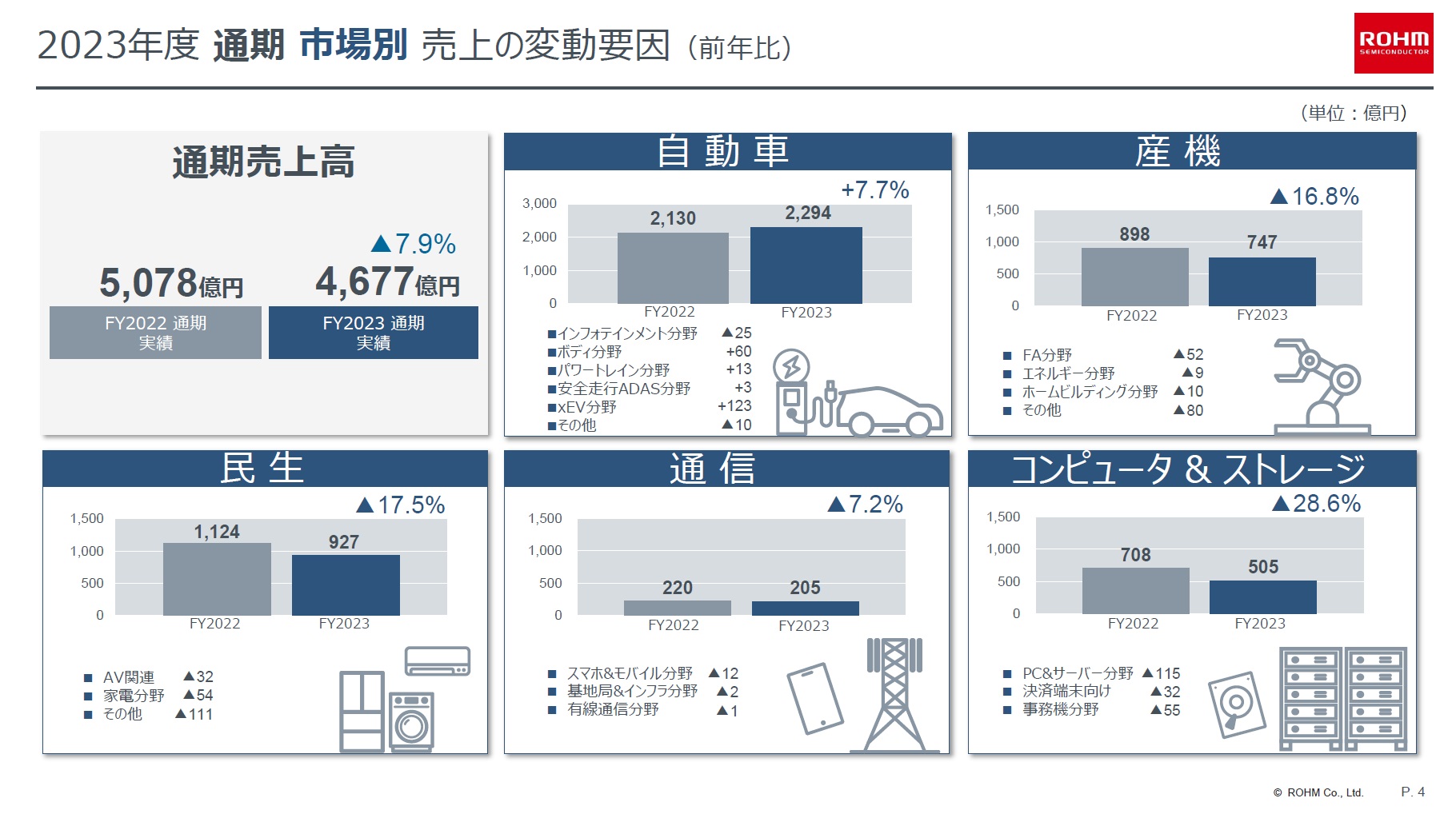 その産業分野別の斑感を確認するのに役立つ資料をご紹介する。下記はローム(6963)が決算説明会で使った資料からの1ページ。ロームは現在「パワー半導体」と呼ばれる分野で活躍しているが、どの分野で過不足が生じているか、こんな分類で見てみると分かり易いだろう。