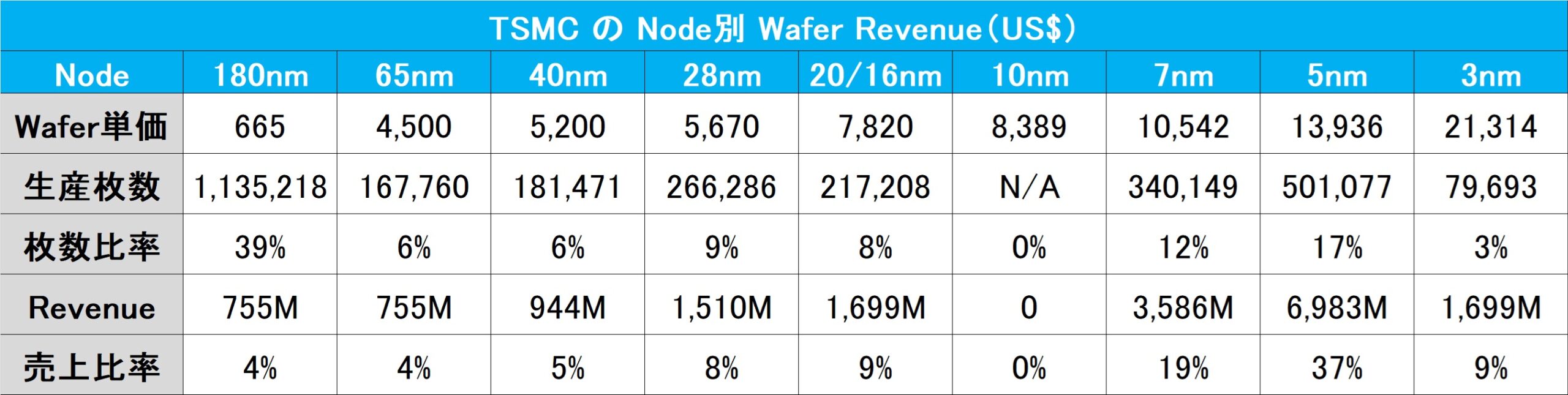 取って置きの資料を作ったので、ご覧に入れるが、下記の表は、微細化レベル(Node)別の「半導体」ウェハーの単価と、TSMCでの生産枚数を纏めたものだ。最下段にある売上比率で見ると、上段の円チャートで示したように、上位3Nodeで65%を占めることになるが、ウェハーの枚数で見ると、180㎚で約4割、微細化などとは既に呼ばないレベルの16nm~65nmで約3割、つまり残りの3割が一般的に株式市場が注目している先端(最先端とは呼ばない)半導体、プラットフォームで言えば、HPCやSmartphoneでの利用ということになる。