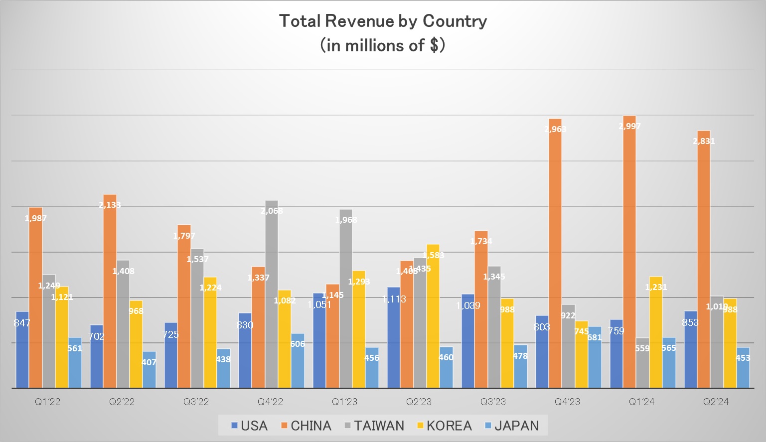今回の決算を受けて社長兼CEOのGary Dickerson氏は、「アプライド マテリアルズは、AI、IoT、電気自動車、クリーンエネルギーといった技術における、大きな変革を支えるチップ向けの最先端の材料工学技術を豊富に持っています。これにより、当社はこれらの長期的な成長トレンドに乗って、さらなる成長を遂げる絶好のポジションにいます」と言っているが、下のチャートで示した通り、市場の懸念はやはり中国にあるようだ。ご覧頂ける通り、足許のアプライドマテリアルズの収益を少なくとも3四半期は中国向けの売上が支えているが、残念ながら、米国の対中国向けの規制の影響もあり、減少トレンドにあることは間違いない。勿論、この3四半期で中国向けが伸びている背景には、中国企業の焦りもあっただろうと思われるが、アプライドマテリアルズのビジネス構造上は中国リスクがかなり高いと思わざるを得ないのも事実。どう贔屓目に見ても、日本が中国の代わりになれるような売上にはなっていないし、それは当分有り得ない話だろう。