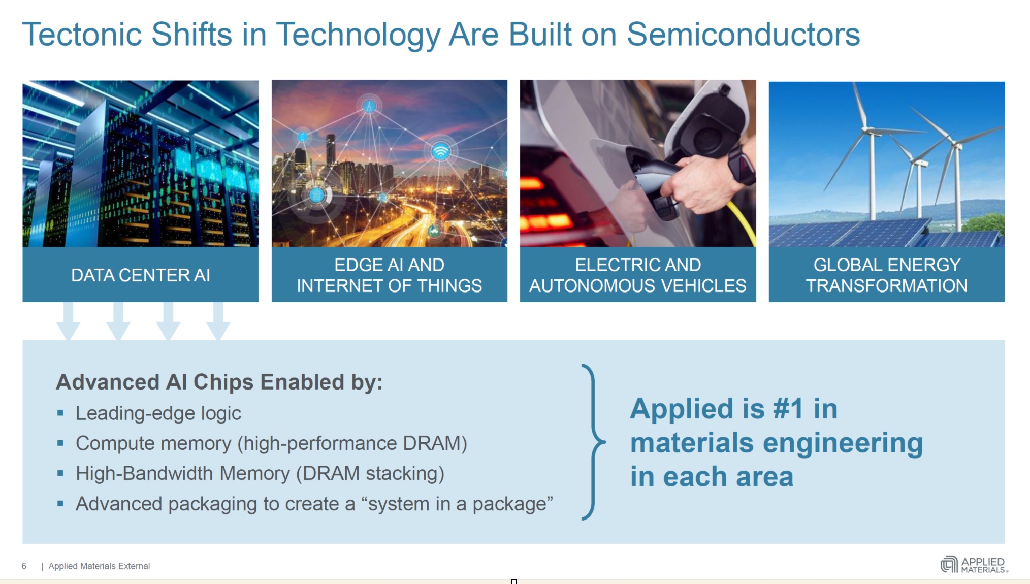 最近、「Inflection」という単語をテクノロジー分野ではよく聞くが、要は「変革点」という意味とお持って頂いて良い。下に示すスライドのタイトル「Enabling Customer Roadmap Inflection」というのは、要は「顧客ロードマップの変革を可能にする」のは当社の製品だということだ。DRAMの材料工学から、記憶素子が論理素子の技術を受け入れると言った話に始まり、それがHBMことHigh-Bandwidth Memory(高帯域メモリー)というエヌビディアのBlackwellに搭載されたような高帯域メモリーに変わるための積層技術のようなものになる現状を説明し、そして最終的にはそれがひとつのパッケージに包まれるということを案内している図だ。この大きなテクノロジーの変革点でアプライドマテリアルズは大活躍出来るとCEOは言っている。