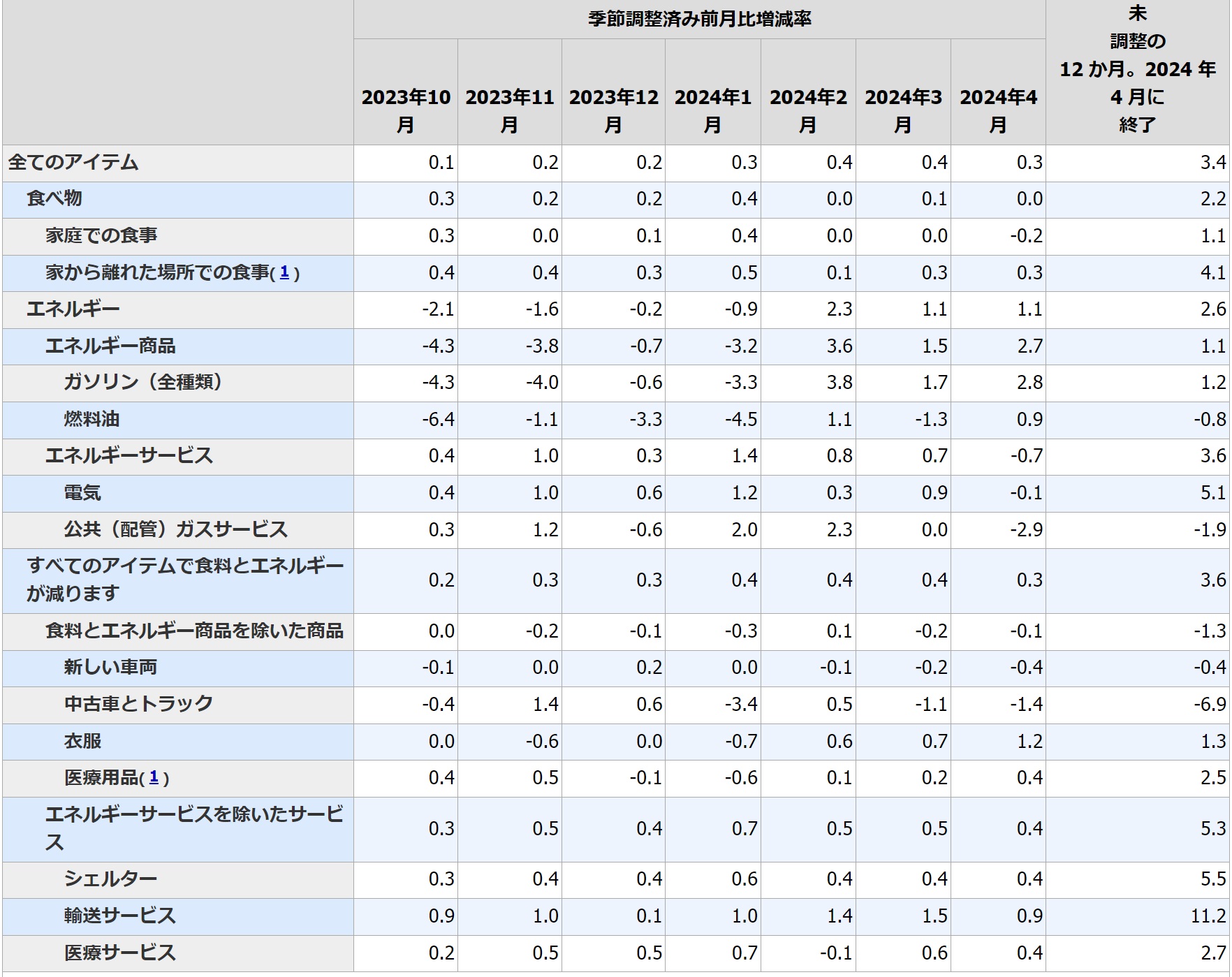 翌日発表された、肝心な法と思われたCPIは、変動の大きい食品とエネルギーを除くコアベースで、前月比の伸びが6カ月ぶりに鈍化し、米金融当局が年内の利下げ開始を検討する上で小さな一歩となると評価された。発表元の労働統計局が住居費とガソリンが総合CPIの伸びの70%余りを占めたと発表したことも後押ししたと言える。下に実際のデータをお見せする。ただ、下の表で確認すると、必ずしも労働統計局が言っていることの裏は取れない気もするが、逆に言えば、何としても、どちらでも良いように取れるとも思えるのは、私の気のせいだろうか。