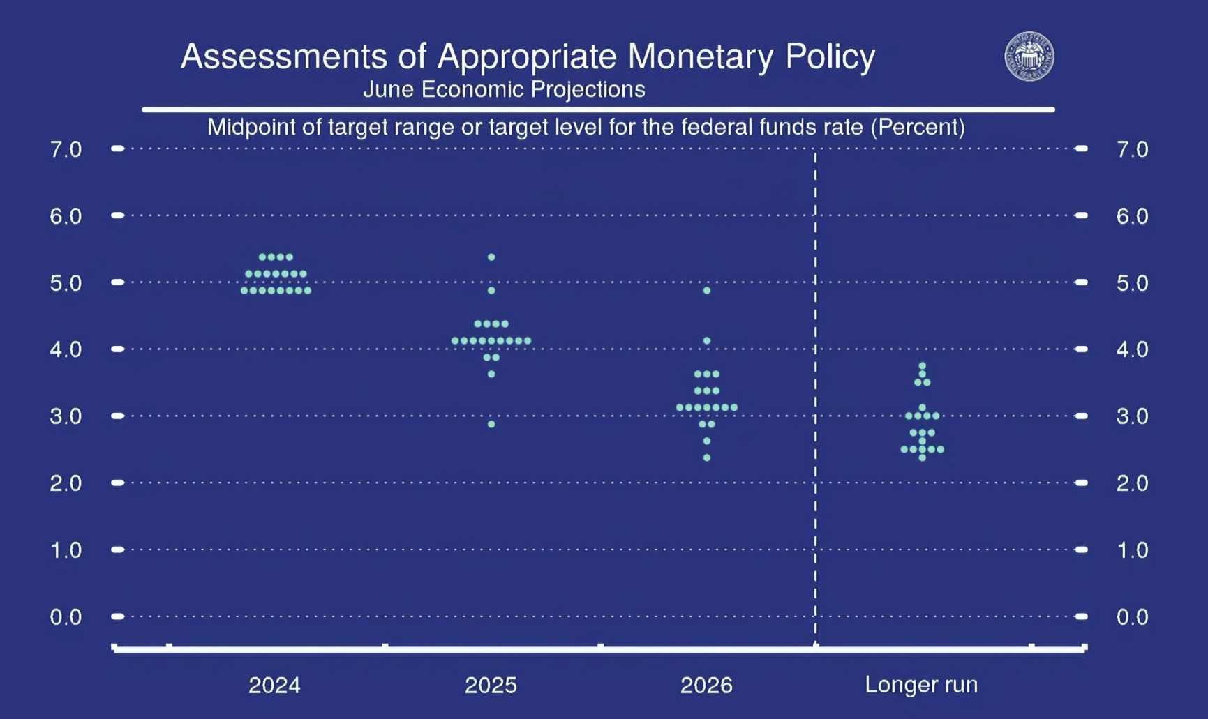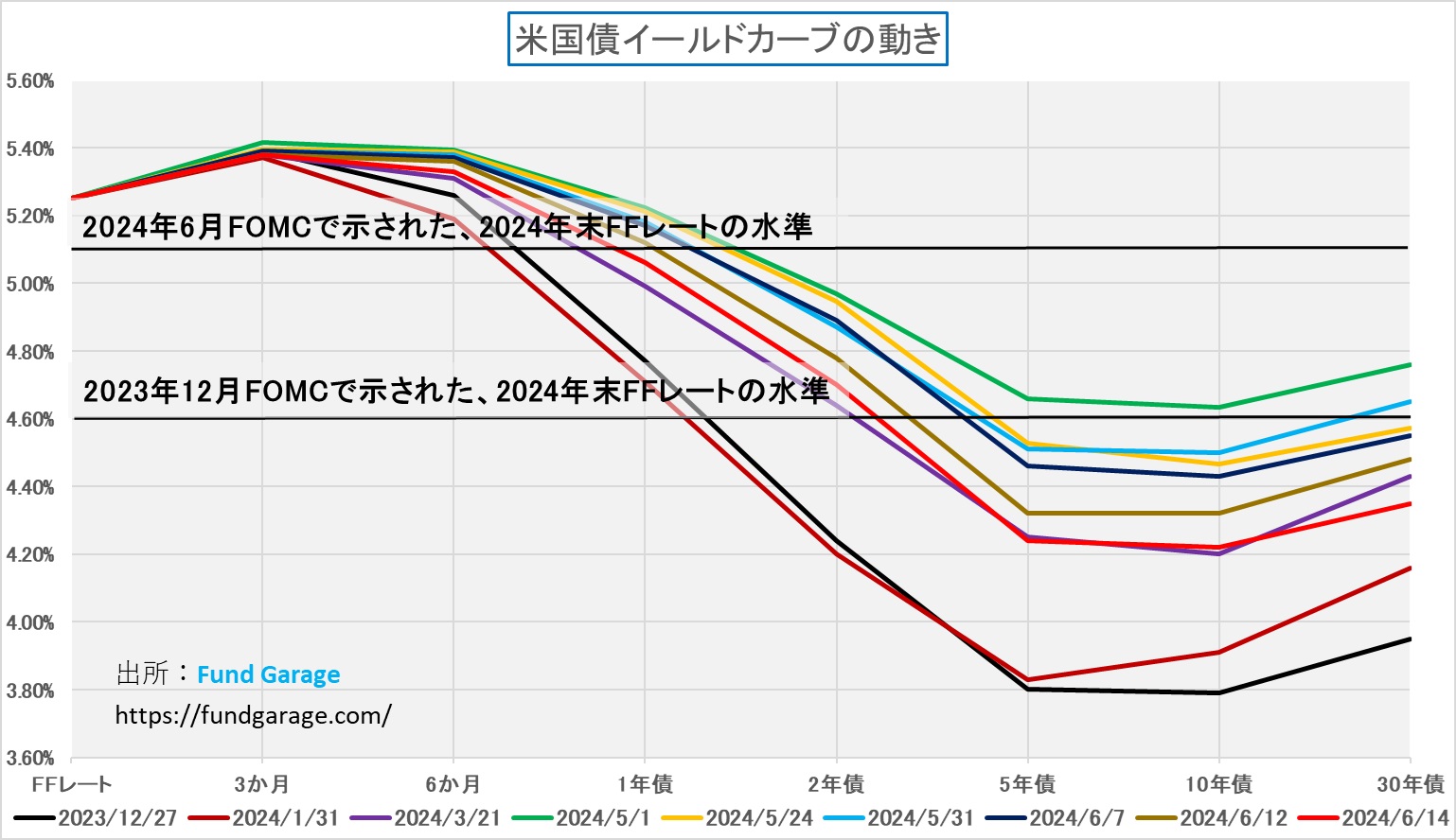 今回のFOMCでは、昨年12月に続いて、3月のFOMCでも同様な結果となっていたドットチャートがアップデートされ、CY2024年末の政策金利水準予想が変更された。すなわち、今まで年末のFFレートを4.6%と予想するのが中央値となっていたものが、0.50%(0.25%の利下げ2回分に相当)引き上げられて5.10%となった。だから市場は「年3回の利下げ見通しが、年1回の利下げ見通しに変わった」という言い方をしている。ただ実はCY2025に変動が殆ど無いので、来年は年4回の利下げがある、すなわち今年の分は後ろに後ずれしただけと見立てることも出来る。