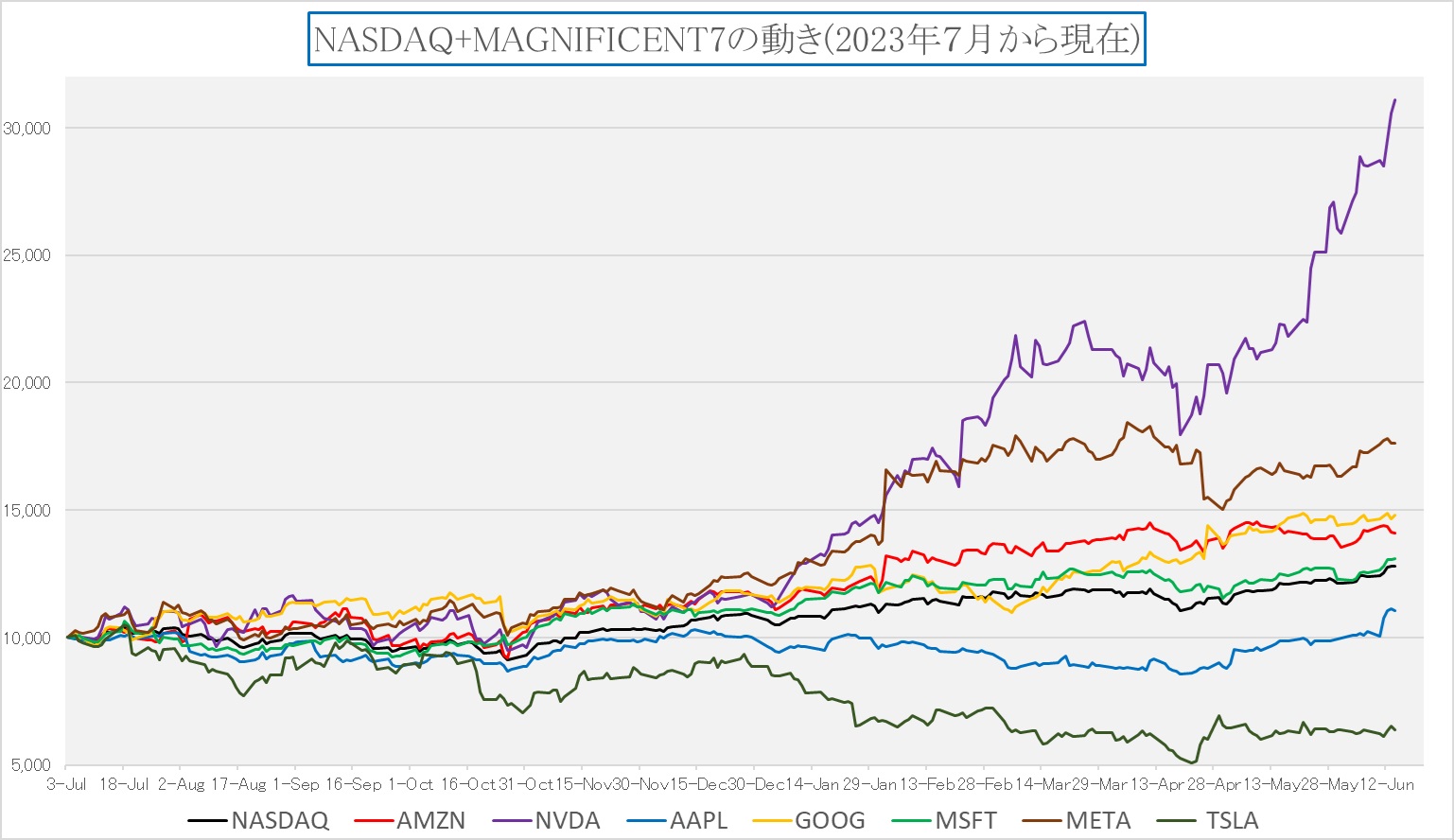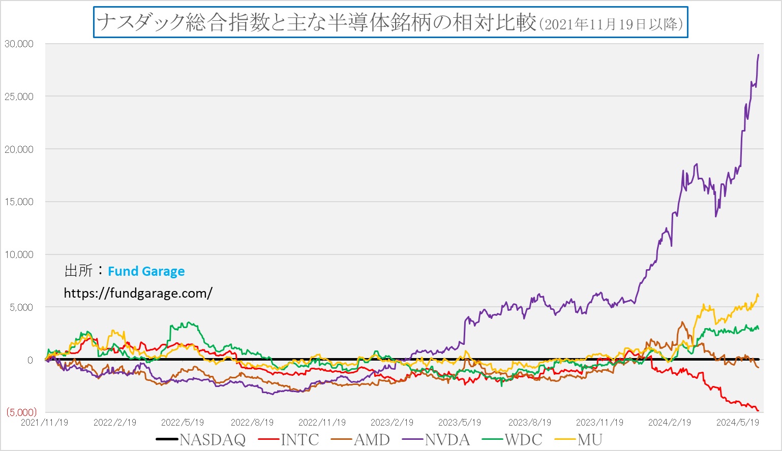 ご承知通り、現在のSOX指数の上昇をリードしているのは、紛れもなく史上最高値を更新し続けているエヌビディア(NVDA)であり、ややこの突出感はスピード調整が必要に見える。実際、毎日いろいろと株価パフォーマンスの相対比較チャート作っているが、このところ、エヌビディア(NVDA)を含むチャートに関しては、Y軸目盛の上限補正を連日のようにしないとならない。エヌビディアの株価がグイグイ上がって、直ぐにチャートの上限を超えるからだ。その一例として、以前はよくお見せしていた半導体銘柄のNASDAQとの相対比較チャートをご紹介しよう。誤解無きように付言すれば、これはNASDAQをどれだけアウト(アンダー)パフォームしているかというチャートであって絶対値を示してはない。すなわち、エヌビディアのリアルな上昇幅は、このチャートに更にプラスすることNASDAQの上昇幅ということになる。アドバンスド・マイクロ・デバイス(AMD)はNASDAQに対して相対的にトントンからマイナスになってきたということであって、絶対値がマイナスという意味ではない。