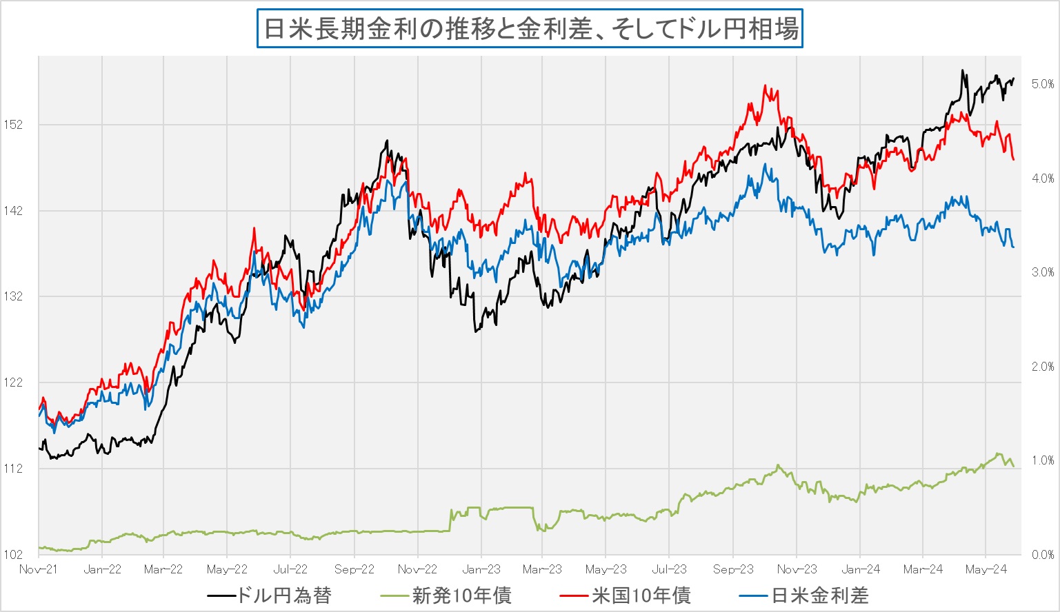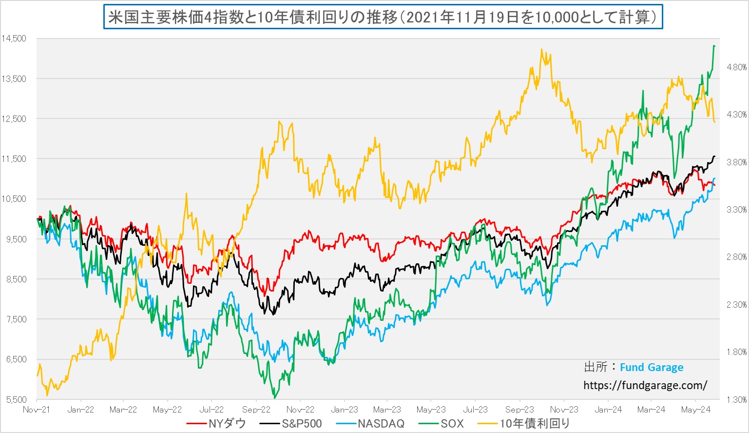 ただご想像の通り、NASDAQだけが調子良いというのはAI関連の半導体銘柄の好調さを反映しているものであり、結局は一番パフォーマンスが良いのはフィラデルフィア半導体指数ことSOX指数だ。もっと言えば、エヌビディア(NVDA)だと言っても良い。米国株主要株価3指数とSOX指数、そして米国10年債利回りのチャートを見て貰えば状況は一目瞭然だ。