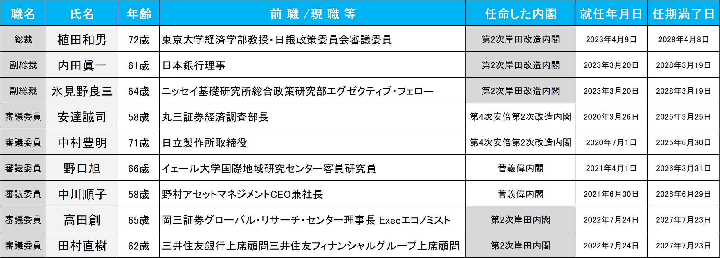 一方、あらためて調べ直してみると、FOMCのそれと、日銀金融政策決定会合のそれとは、そもそもその構成メンバーのバックボーンというか、属性に日米で大きな違いがあることに気がついた。日銀金融政策決定会合の審議メンバーの属性一覧を下記にお示しする。個人的な感想を誤解を恐れずに敢えて言葉にすれば、そこには実に「日本的な有識者」の会議と言っても過言ではない印象がある。