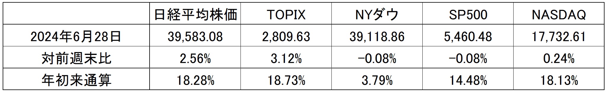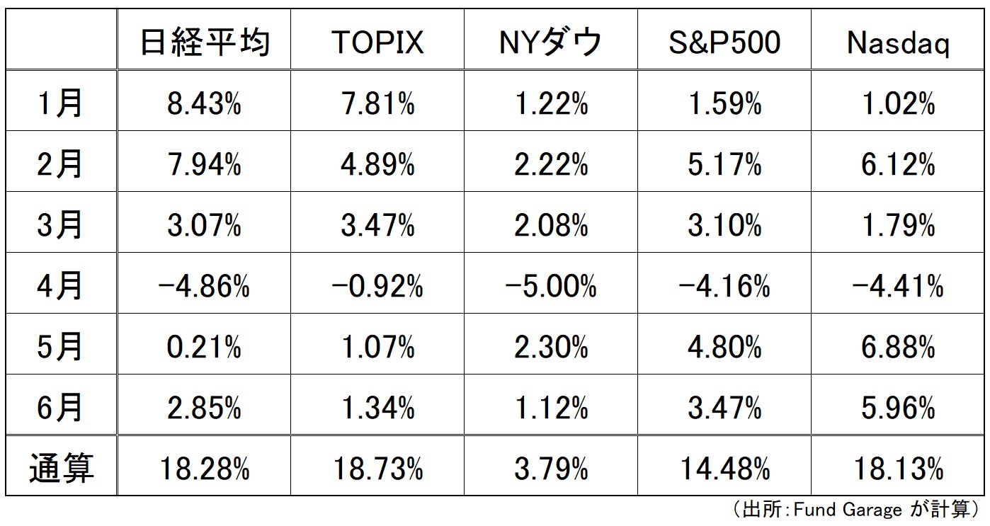 先週の日米株式市場の週間騰落率は下記の通り。先週は久し振りに日本株市場がプラスに動いた。その大きな理由のひとつは6月末残高に反映される最終売買日を通過して、需給が変わったということだろう。