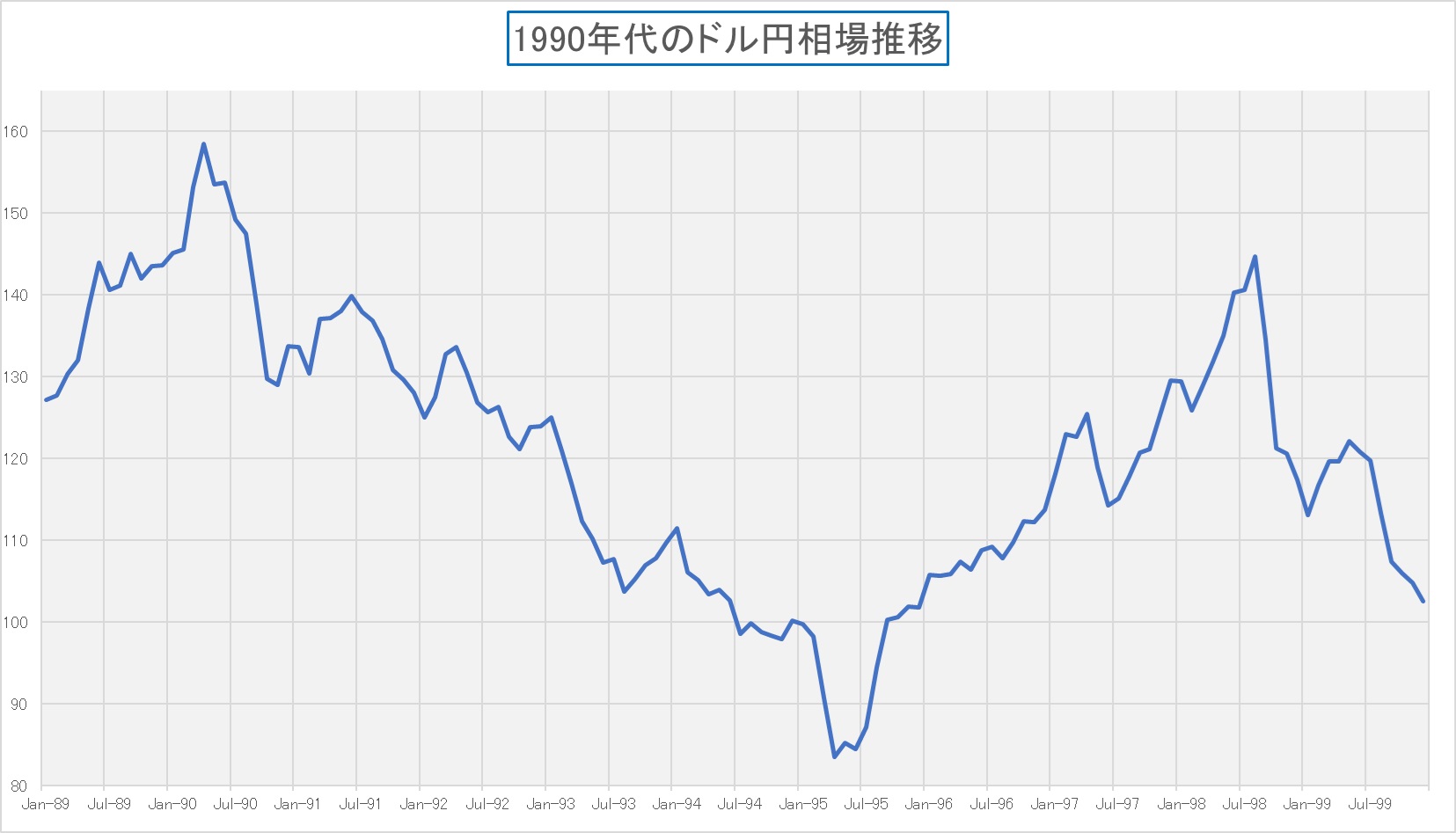 さて、そこで問題。これらの時代背景を再考し、下記のチャートが示す1990年代のドル円相場の流れを、合理的に説明して欲しい。端的なポイントとしては、なぜ1995年にドル円相場は85円台を超える円高となったかということだ。Thinking Time!