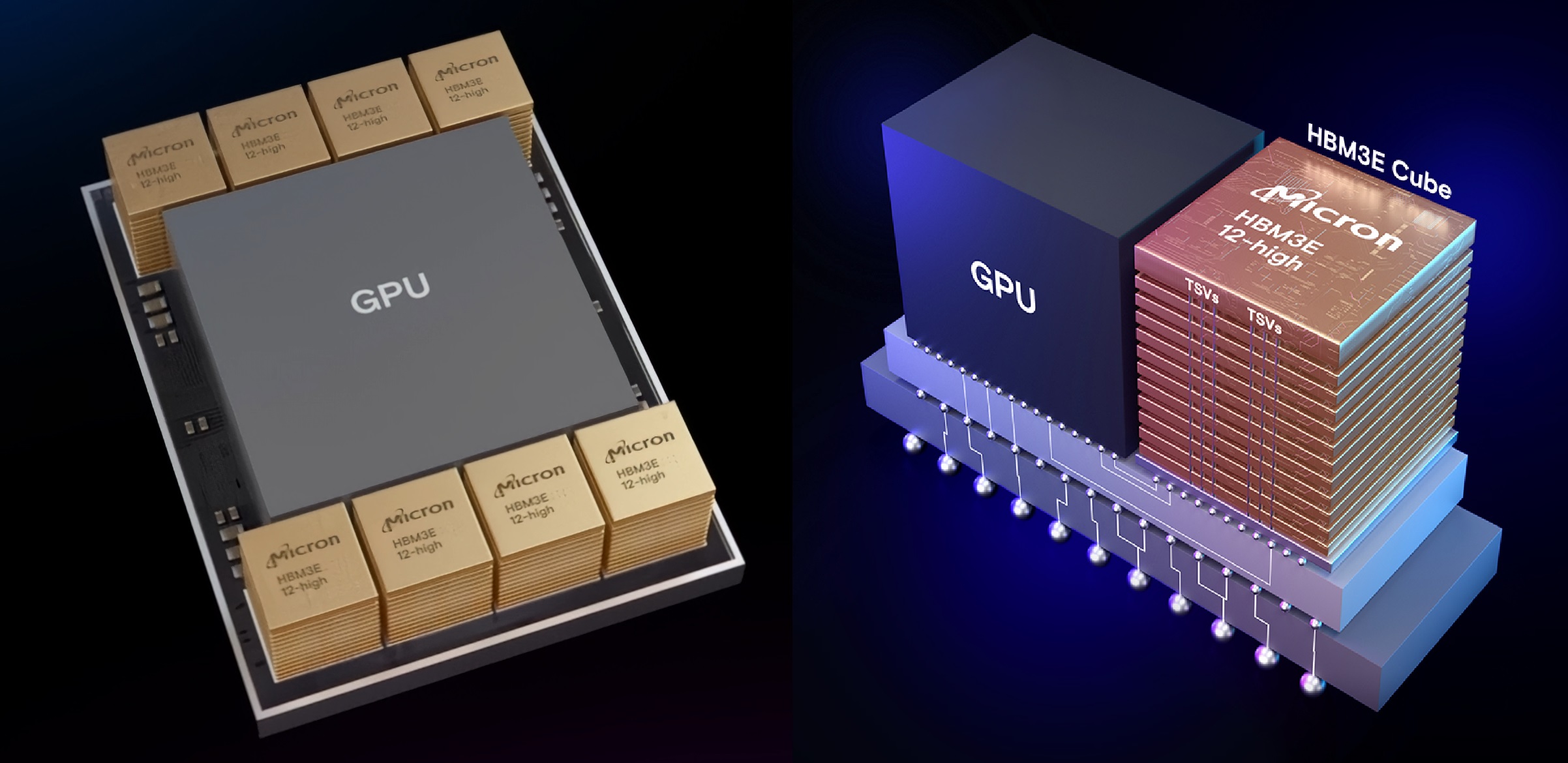 因みに、マイクロンテクノロジー(MU)が作っているHBMとは、下の写真で示すメモリーチップのこと。GPUとあるのがエヌビディアの製品で、それを取巻くように8つのキューブがあるが、それは右側の写真で見るように、12枚のチップが積み重ねられているもの。この積み重ねる方法も特殊な技術が必要なことは言うまでもない。チップの枚数で言えば、12枚×8個のキューブで96枚が、ひとつのGPUパッケージの中に搭載されている。飛んでも無い技術の塊と見ることが出来る。
