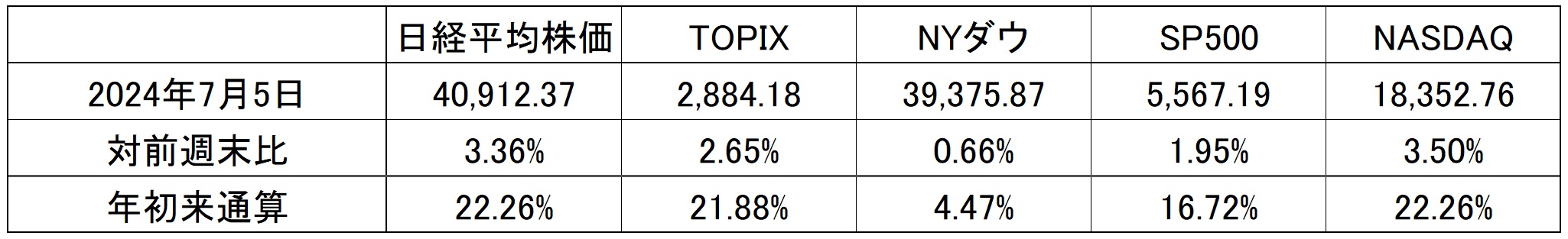これまた予想した通りなのだが、6月末までの売り需給は、7月に入って下半期入りしたことで峠を越えたようだ。やはり6月末、CY2024H1、若しくはFY2024Q1のデータとして記帳される帳簿データとして保持したくない圧力が掛かる銘柄は多かったのだろう。そのひとつの証左がトヨタ自動車(7203)の動きだ。好決算を発表し、円安がさらに進み、認証問題で生産停止になっている車種(実際には数%の売上ダメージに過ぎないと言われている)があったとしても、6月第3週の3050円前後の値付けには「どこかが最後の叩き売りをしてポジション外しているな」と思っていたが、案の定、既に底値から約1割の回復となっている。と言ってもまだ充分な戻りでは無いが、需給改善のリバウンドはトヨタ自動車以外にも当然拡がった。そうした結果の日米株式市場の7月第1週の騰落率は下記の通り。また年初来の指数騰落率でみると、日経平均とNASDAQが偶然でしかないが、ピッタリ一致している。