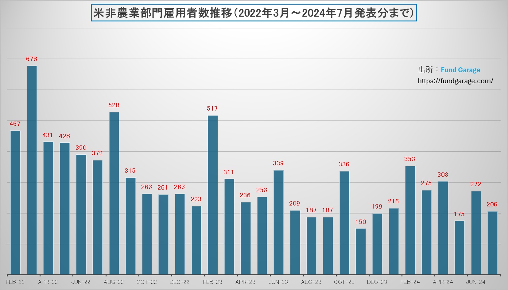 下のチャートは2022年2月からの非農業部門雇用者数の推移を示す単なる棒グラフだ。時々イレギュラーに飛び抜けるものもあるが、普通に観察すれば、人間の脳のニューラルネットワークは、普通に「傾向は右肩下がり(減少傾向)だ」と見極める筈だ。ポストコロナで急激に「何もかもが売り手市場」で労働市場の需給が猛烈にひっ迫していた状況とは、今はかなり違うだろうと予測するのに無理はない。