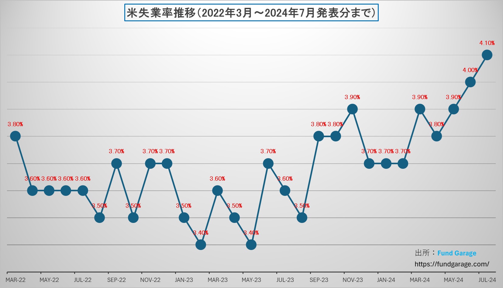 そして次がこれ。今度は失業率の推移を折れ線グラフで示したものだ。これも余程ひねくれた画像認識をしない限り、2023年に入ってからは、何となく右肩上がり、つまり失業率が徐々に高まってきている(雇用環境は緩む)と見極めることが出来るだろう。実はこれこそがチャートを作ったり、見たりすることの最大メリットなのだから。傾向値を掴むためにはチャートを描いてみるのが一番役に立ち、チャートを作るには、Excelがあれば簡単に作業出来る。勿論、プレミアムレポートの読者の皆様には、こうして常に投資家が確認すべき、必要なデータはFund Garageの方で用意してご覧頂いているので、特に作業をして頂く必要はない。ただご自身のスキルアップの為、というのならば話は別だが・・・。
