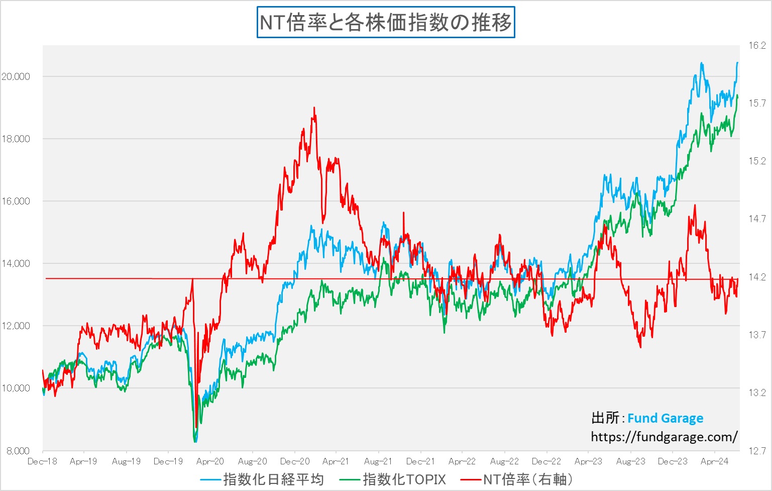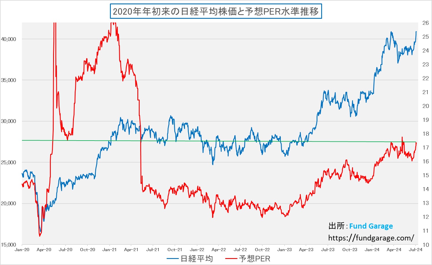 先週末で確認出来る日経平均株価の水準は40,912.37円。ザラ場ではあと一息で41,000円という水準も示現していたが、このままの勢いで42,000円、43,000円・・・・と株価上昇は続くのだろうか?結論から言えば「ここからはポジティブ・サプライズが何かないと、株価上昇は厳しいだろう」と思っている。というよりも、私の感覚的には現状の水準すら「本当にサポーティブなレベルなのか?」とさえ思っているぐらいだ。確かに、この間は日経平均もTOPIXも、同じように上昇しているので、先物主導で日経平均だけが上昇という状況にはなっていない。赤線で描くNT倍率が突拍子もなく上昇しているのでない以上、先物取引で意図的に日経平均が吊り上げられているという感じはしない。