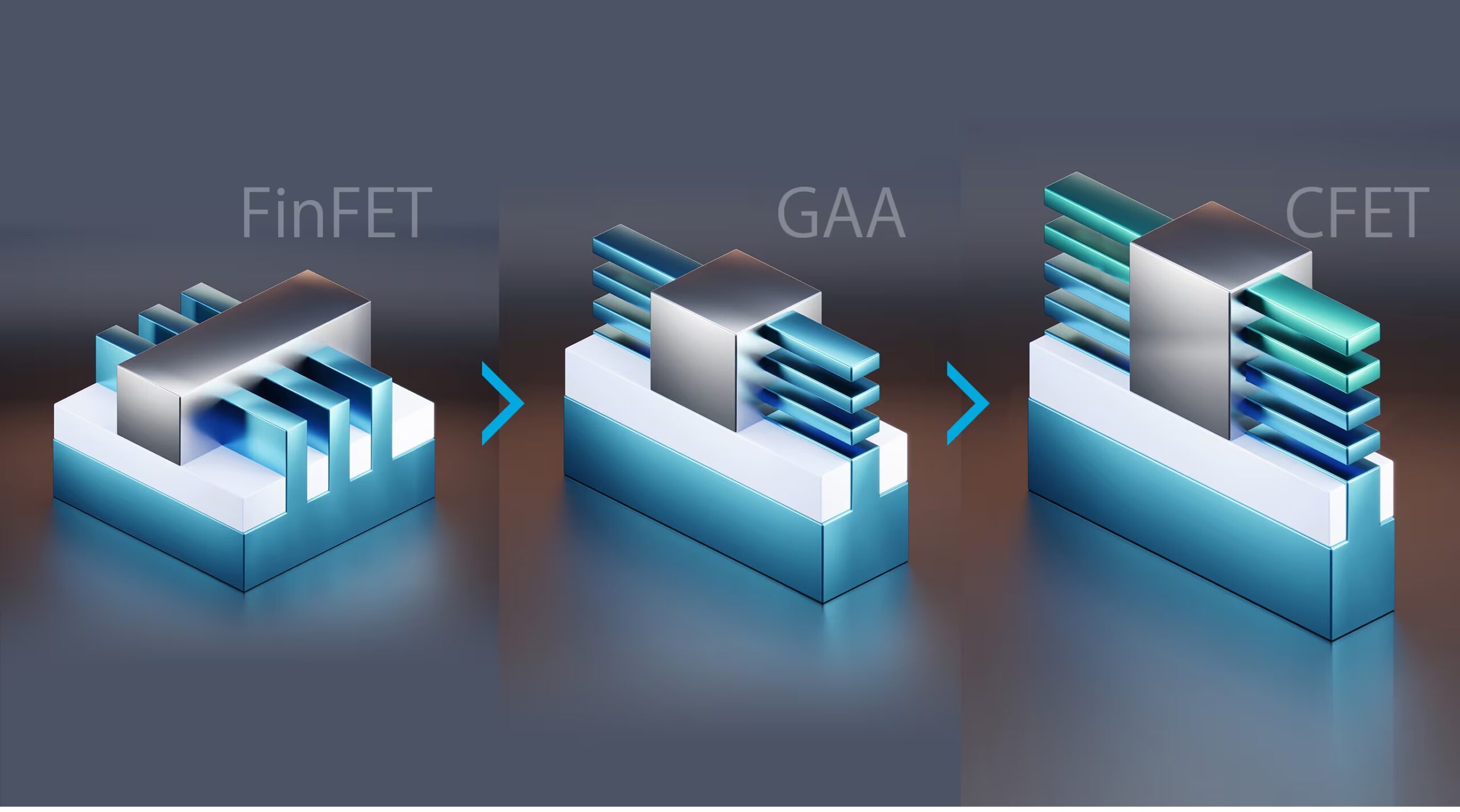 また「最先端のロジックでは、トランジスタとインターコネクトの両方における主要なデバイスの変曲点が、現在、チップメーカーの研究開発パイロット ラインから大量生産へと移行しています。FinFET からゲート オール アラウンド トランジスタへの移行により、Applied のトランジスタ モジュールの市場規模は、1 か月あたり 10 万ウェーハ スタートの生産能力あたり約 60 億ドルから約 70 億ドルに拡大します。また、ゲート オール アラウンドへの移行を通じてシェアを拡大することも期待しており、トランジスタ製造ステップのプロセス機器支出の 50% 以上を獲得する見込みです。」と鼻息も荒い。以下の写真がFinFETからGAA、そして更にその先のCFETの構造図(これは東京エレクトロンのWebページより転載)