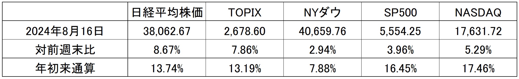先週一週間の日米株式市場の騰落率を見ると、これはかなり凄い展開だったと言える。一番凄いのが日経平均で、対前週末比で3,037円もの上昇幅(+8.67%)となる値上がりを演じ、見事に38,000円台を回復した。ただこの上昇は、TOPIXの値上がり率を約0.9%も上回るものであり、NT倍率も14.10倍から14.21倍へと上昇している点には注意が必要だ。米国市場の3指数については、やはりNASDAQ総合の値上がり率がトップで+5.29%となっている。だからこそ、日本株市場での値嵩ハイテク関連銘柄の値上がりが目立つこととなったようだ。ただ更に言うと、より上昇しているのがフィラデルフィア半導体指数ことSOX指数で+9.78%と一割近くの上昇となっている。ならば更に突き進むと、現在の米国市場でアップル(AAPL)、マイクロソフト(MSFT)に次いで時価総額第3位のエヌビディア(NVDA)の動きはどうだったかというと、実に+18.93%となって7月16日頃の水準にまで戻っている。
