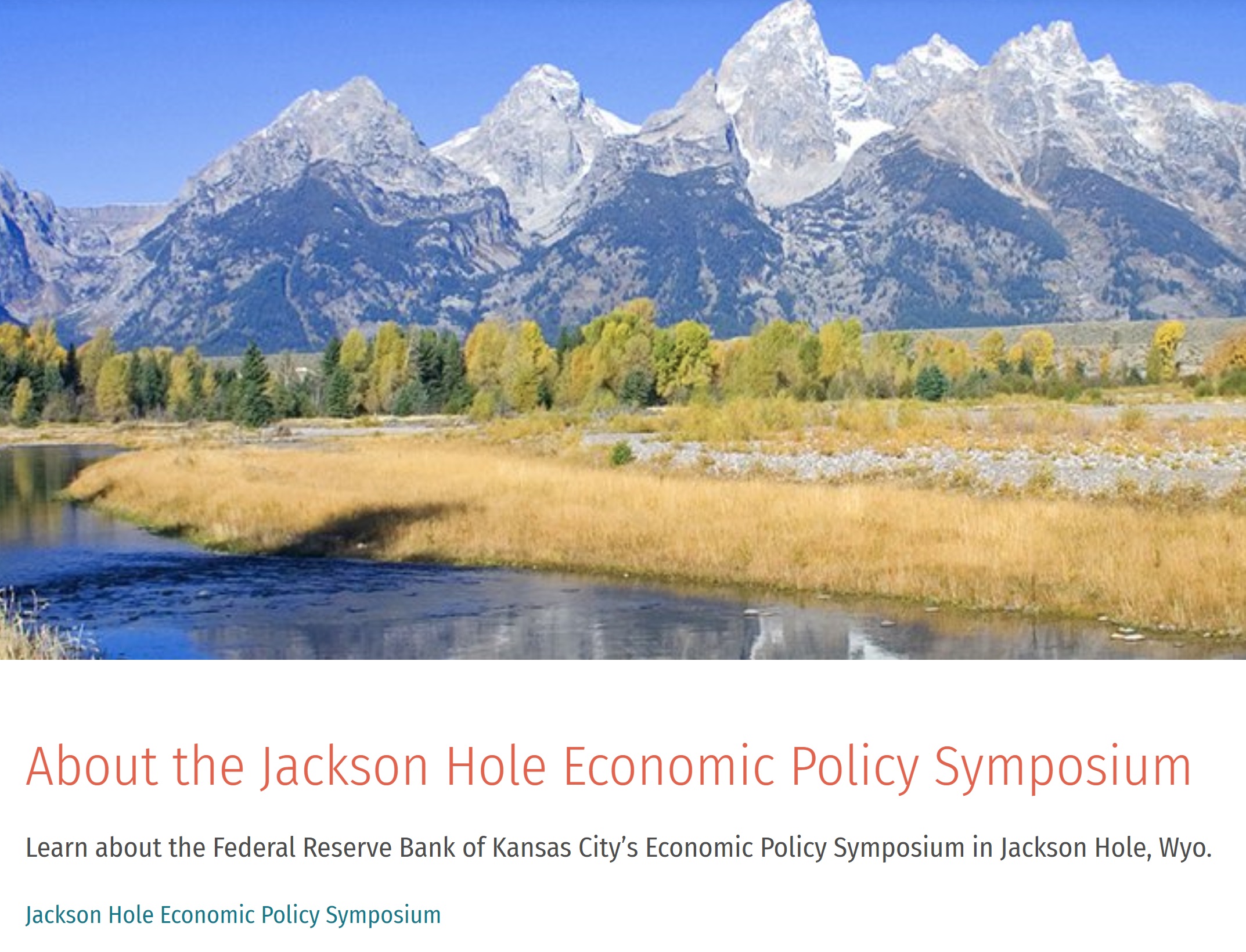 8月22日(木)から24日(金)に「ジャクソンホール会議」が開催される。「ジャクソンホール」とカタカナで書いてしまうと何処かの会館か?と思われてしまうかも知れないが、英語だと「Jackson Hole」であって、コンサートホールのホール(Hall)とはスペルが違うことにご注意(笑)。実際に世界各国の中央銀行総裁や財務大臣、学者、金融市場関係者が参加して、経済政策について議論するシンポジウムと言われると、警備上の都合などもあって違うイメージを抱かれるかも知れないが、HoleとHallでは全く違う意味になる。発音も違う。近隣にイエローストーン国立公園やグランドティトン国立公園などがある。下の写真が主催のカンザスシティ連邦準備銀行が用意したWebページだ。クリックして貰えば、当該Webページに飛べるので、ご興味があれば是非ご覧頂きたい。恐らく、そんな事からも、米国の何かが見えてくるかもしれない。