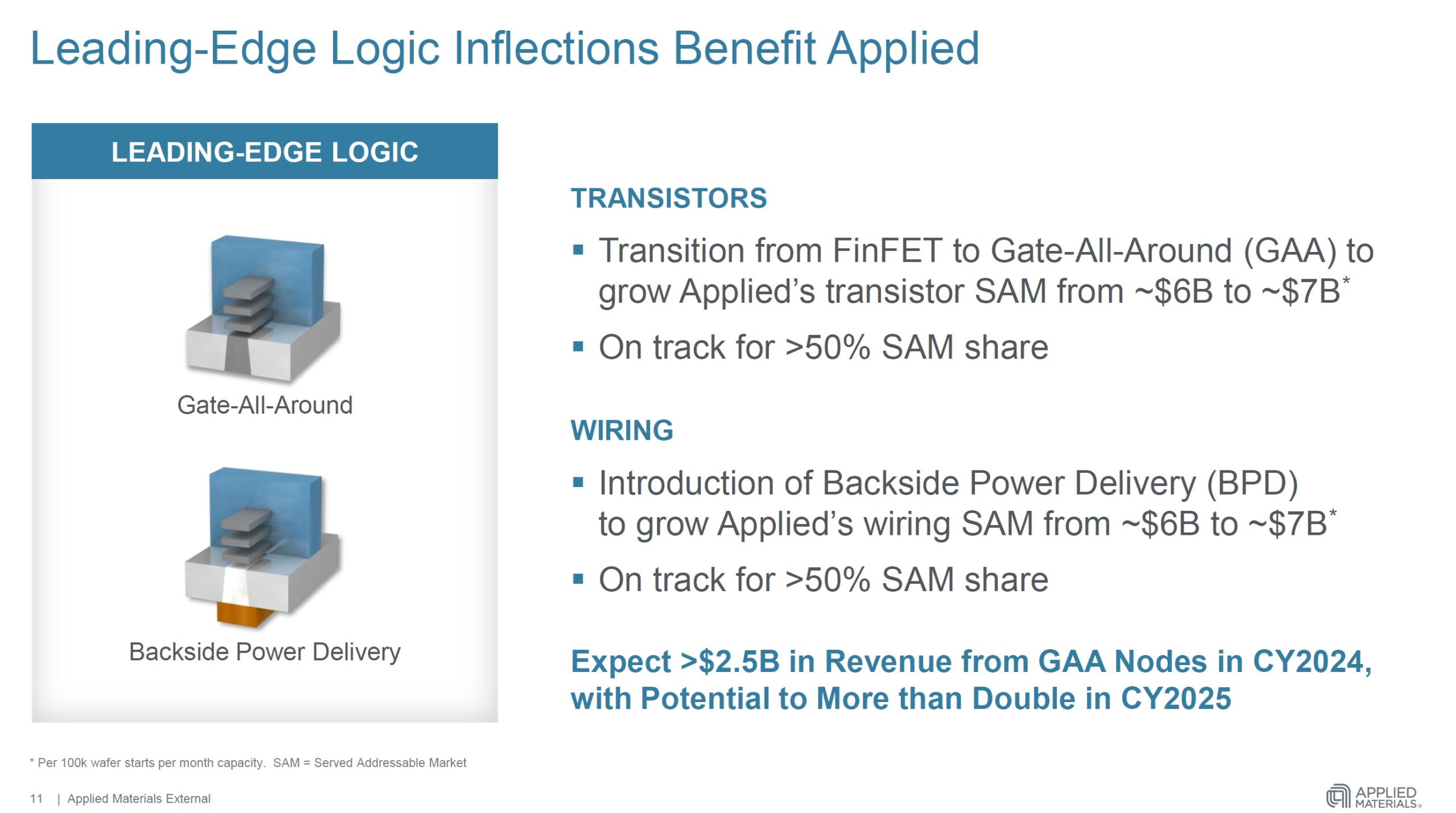 また所謂HBM、High Band Width Memoryのことだが、現在データセンター向けのGPUに混載されるメモリーとして需要が高く、一方で、つい先日までSKハイニックスとマイクロンテクノロジーしかエヌビディアの認定が取れず、Samsungが苦戦したりしていたこの分野、やはり製造装置が肝を握るようだ。ゲイリー・ディッカーソンCEO曰く「高帯域幅メモリを可能にするダイスタッキング技術においても、当社はマイクロバンプとシリコン貫通ビアの両方で強力なリーダーシップの地位にあります。2024年には高帯域幅メモリの需要が加速すると見込んでおり、今年のHBMパッケージングの売上高は2023年の約6倍となる6億ドル以上になると予想しています。HBMを含め、当社の先進的なパッケージング製品ポートフォリオからの売上高は2024年に約17億ドルに成長すると見込んでいます」という。これはアプライドマテリアルズについても朗報であるが、これすなわちビジネス現場の最前線に立つAMATのCEOがデータセンタGPUの需要にお墨付きを与えたようなものだ。また付加価値の源泉となるのは「今後のノード移行を通じて、材料工学がウェハ製造装置全体に占める割合は、ロジックとメモリの両方で増加すると予想されます」という。