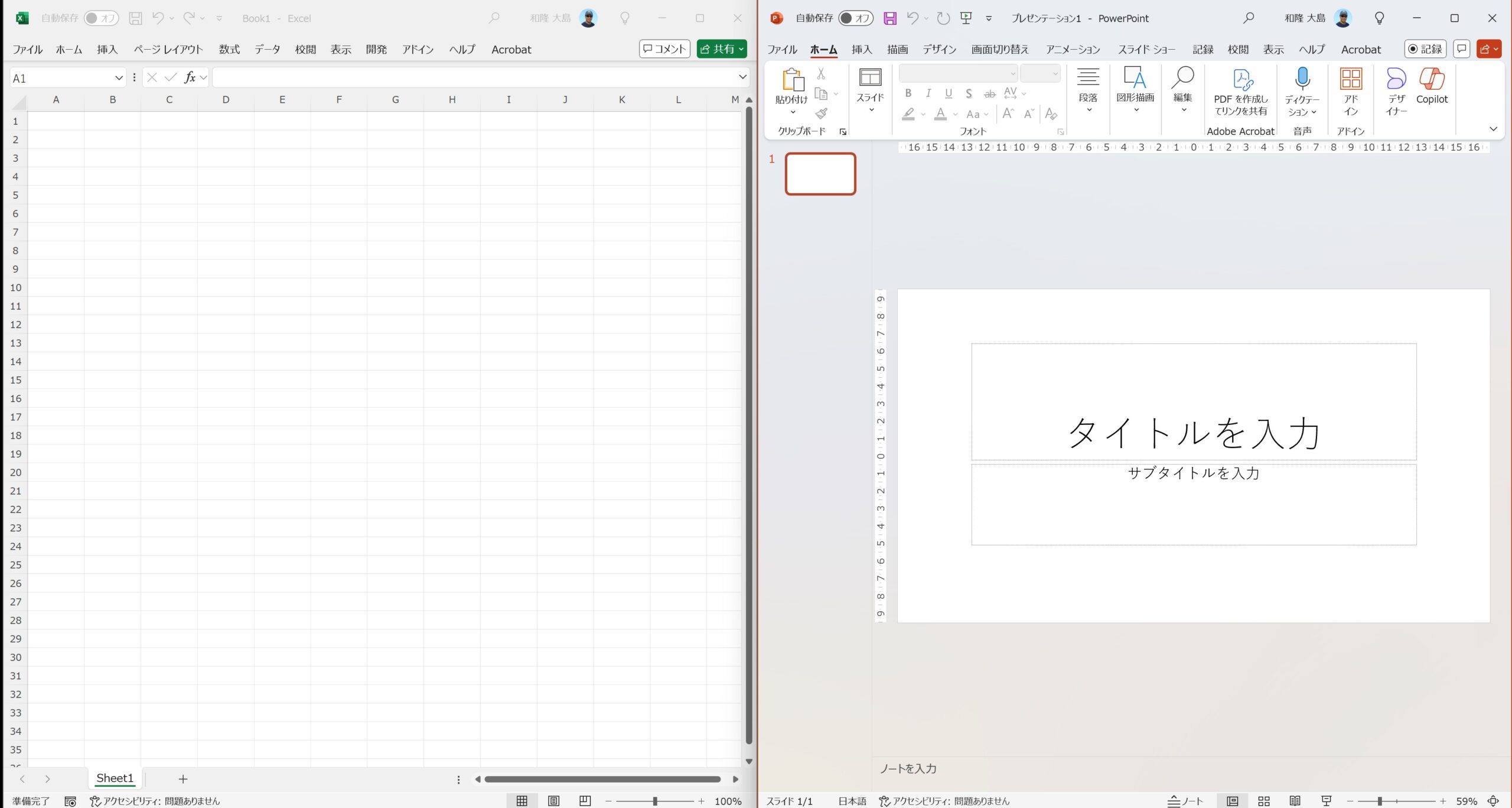 それと極めて基本的なことをひとつ。下の写真、左がExcelシートの新規ページで、右がPowerPointの新規ページだ。使い慣れている人にとっては、これらは無くてはならないオフィス系アプリの基本で、これらをどこまで使い込めているかで、仕事が出来る人か、そうでも無いかが直ぐに分かる。実際、中途採用面接で「Excelは使えますか?VBAマクロは書けますか?」というような質問は必ず行われていた。ただ考えてみて欲しい。自分自身の記憶を辿っても、初めて表計算ソフトに出会った時、何の説明も、ガイダンスも無ければ、これが自分の仕事の作業効率に革命的な変化を与えてくれる代物などとは努々思うことは無いだろう。印象としてはPowerPointの方がもっと酷い。「これでプレゼンテーション出来るように企画書を纏めて」といきなり言われたら、恐らく出社拒否症候群に陥ることは間違いない。だが、使い込めば使い込むほど、これほど便利なofficeツールは他に無いだろう。