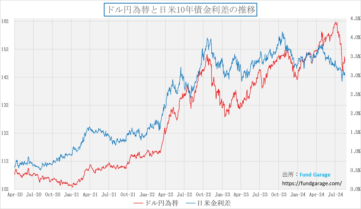 それは為替の動きを見て貰っても、非常に単純に良く分かる。下のチャート、ドル円相場と日米10年債利回りの金利差の推移のチャートだが、全くと言っていいほど、金利差で為替の動きは説明出来ない状態が続いていることがその証左だ。そしてひと騒動を終えて、再び円キャリー取引を始めたので、ドル円相場は再び円安に動き始めたということだと考える。少なくともこの時点、すなわち米国大統領選挙のタイミングと合わせるかのように日本の首相が変わることは、少なくとも円高要素にならないことも付け加えておきたい。