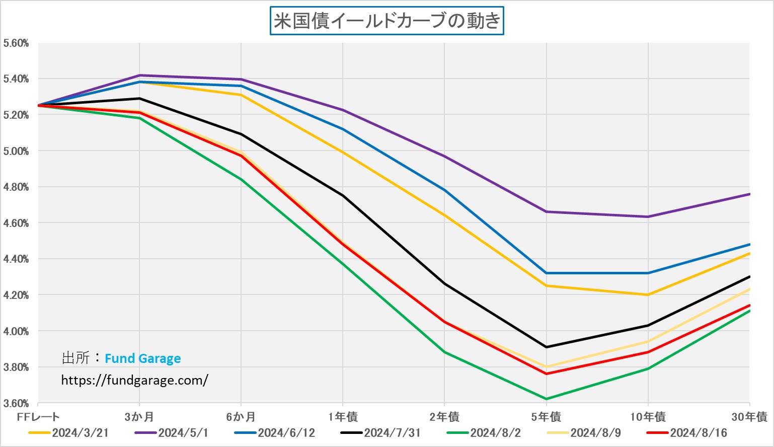たとえばこの間の米国債のイールドカーブの変化を見てみると、下記のチャートの様になる。FRBが金融政策の現状維持を発表した7月31日は黒の線、そして週末に日本でドスンと最初の株価急落があり、為替が円高方向に第一弾で動いた8月2日が緑の線、そして前週末の9日が黄色で、先週末16日が赤い線だ。ご覧頂ける通り、この辺りの時系列の動きにきちんと流れを説明出来るシナリオ(台本)を書くとしたら、「日銀の利上げによって、急激に円キャリー取引の巻き戻しが起き、一斉に資産売却が起きたからこそ、こうなった」と説明するのが一番簡単で筋が通る。パッシブ運用の増加が、マクロ経済統計(雇用統計)を絡めた投機筋の仕掛けにまんまと嵌まったとも言える。引け前10分の売りが、8日、9日ぐらいまで続いたことでもそれを説明出来る。だが、前回もお伝えした通り、0.15%の利上げ程度で「円キャリー取引」を大騒ぎして巻き戻さないとならない程に、投機筋はローリスク・ローリターンの戦略は取っていないのだろう。