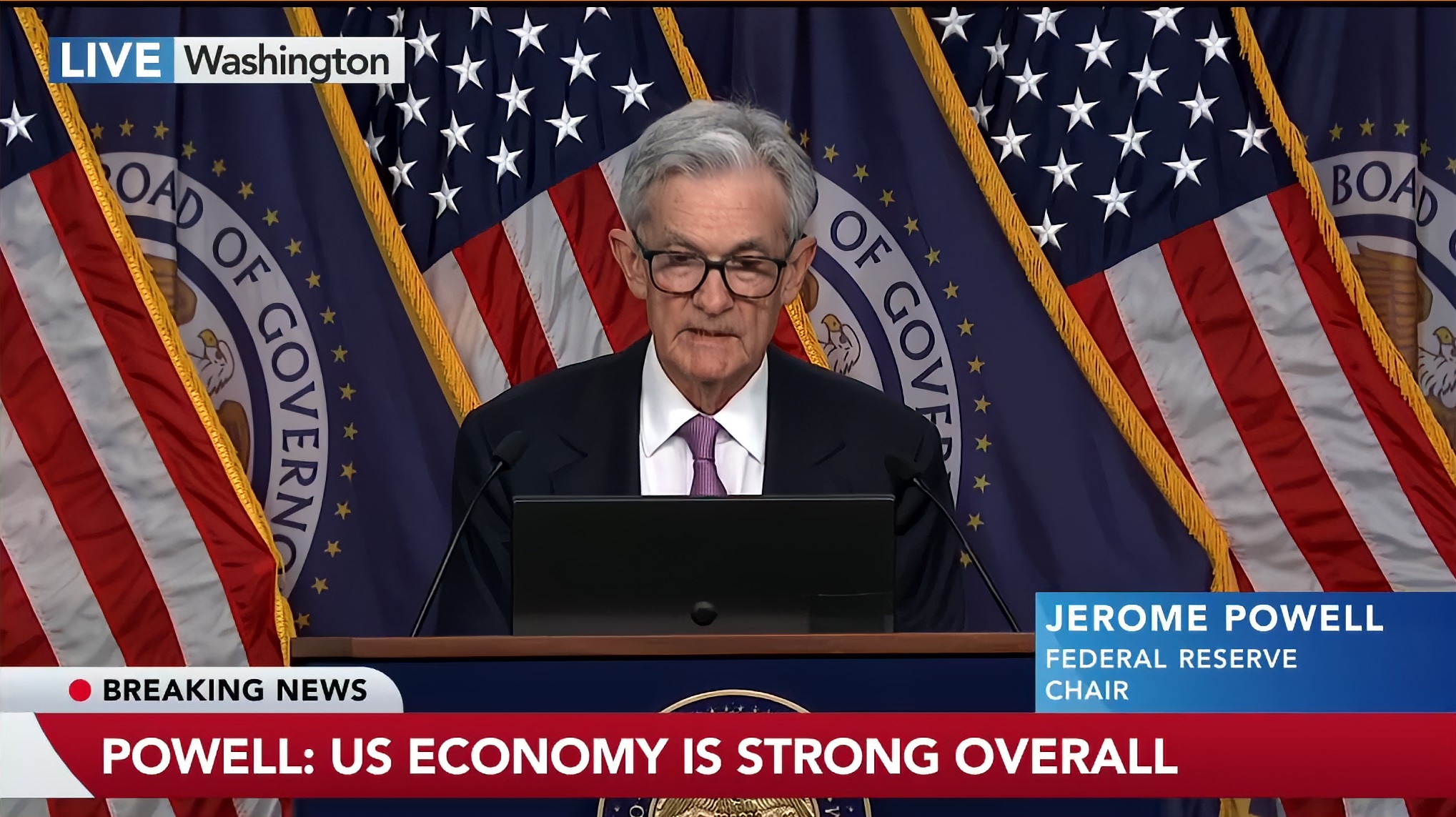 下の写真、パウエル議長が「US ECONOMY IS STRONG OVERALL(米国経済は強い)」と言ったことがBreaking News として確認出来る。