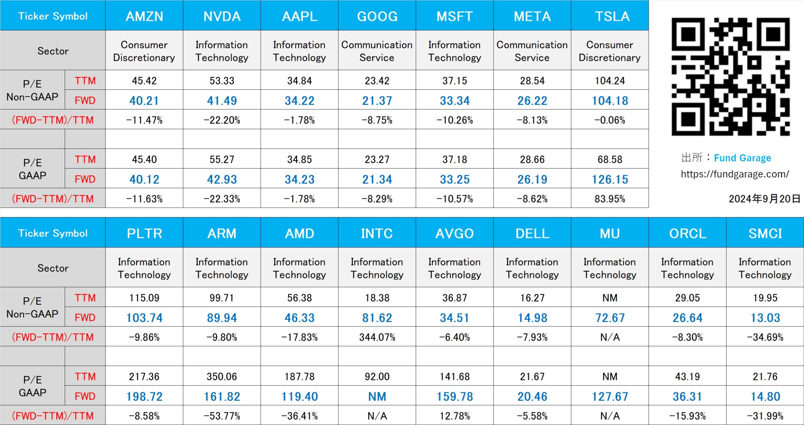 下記の表はいつもの米国株のPER(9月20日付)。だらしない日本株と異なり、値上がりした分、PERも上昇しているが、割高感は感じられない。