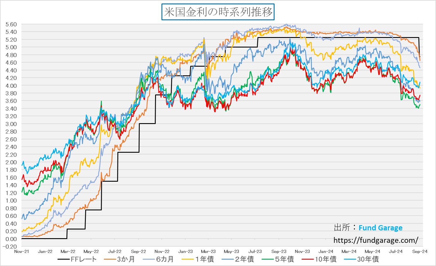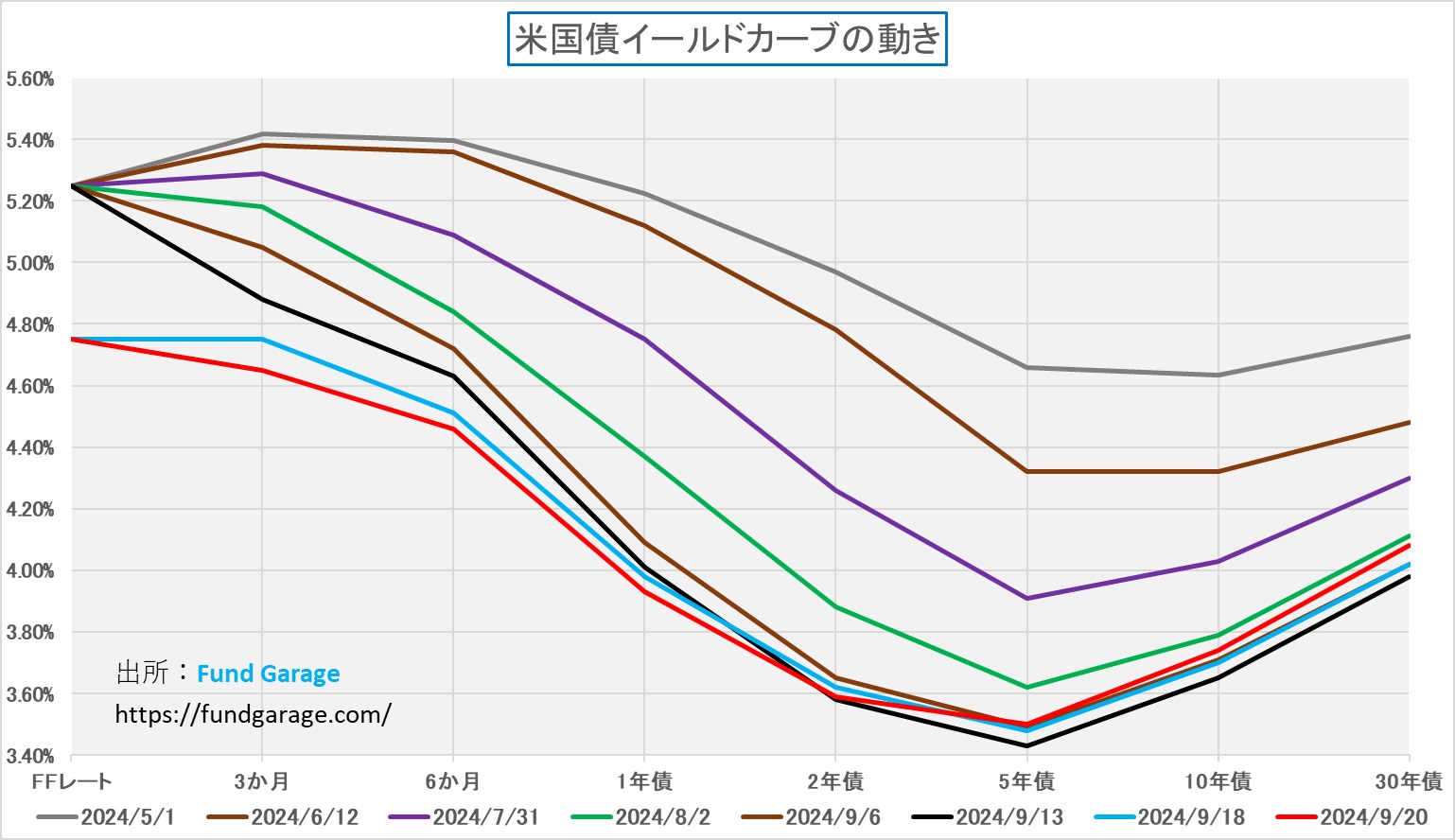 久しく逆イールド・カーブとなっていた米国債の金利の期間構造だが、FOMCの直前から、徐々にではあるが2-10年債のところから正常が進んでいる。この短い部分だけをとって手放しに喜ぶことは出来ないが、2022年7月から続いている逆イールド現象が順イールドになるように向かい始めたことは好ましいことだ。下のイールドカーブのチャートでは、FFレートが0.25%下がったが、他の期間金利の低下はそれ以内に収まっている。一方で、先週末の赤い線のイールドカーブならば、2-10年債の順イールド化はさらに進んだともいえる。
