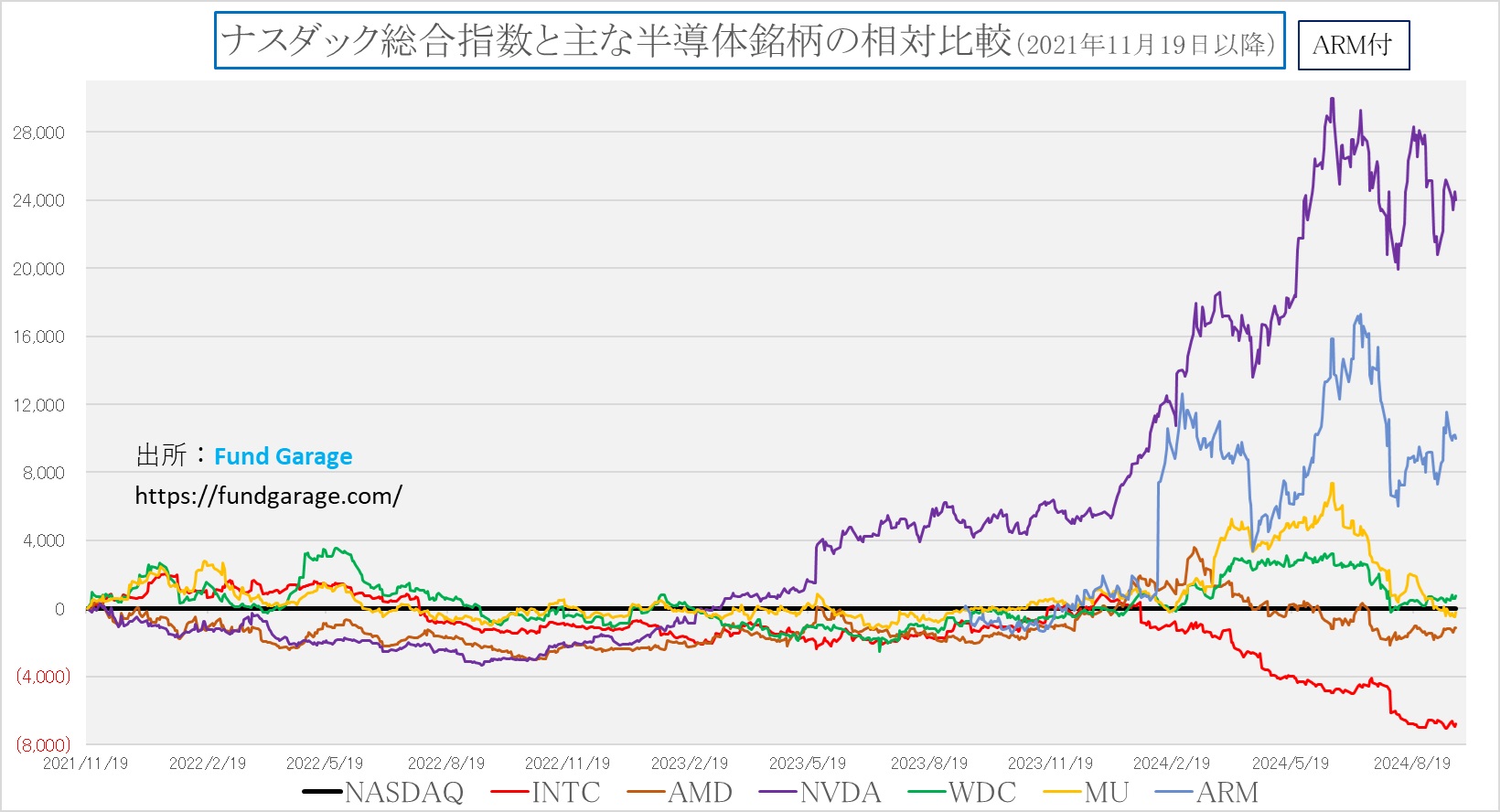 ただ、仮に今回の買収が成立しなかったとしても、今の技術トレンドの中では、この流れはある意味で必然であり、ハイテク業界恒例の盛者必衰の理を表すという一面の真実かも知れない。下のチャートを見て頂きたいのだが、2024年に入り、各種半導体メーカーの中で、エヌビディア(NVDA)とアームHD(ARM)の株価はNASDAQに対して大きくアウトパフォームしているが、その反対にインテル(INTC)は完全にアンダーパフォームとなっている。完全に正反対の動きとなっているが、今回はこの意味するところを考えてみたい。