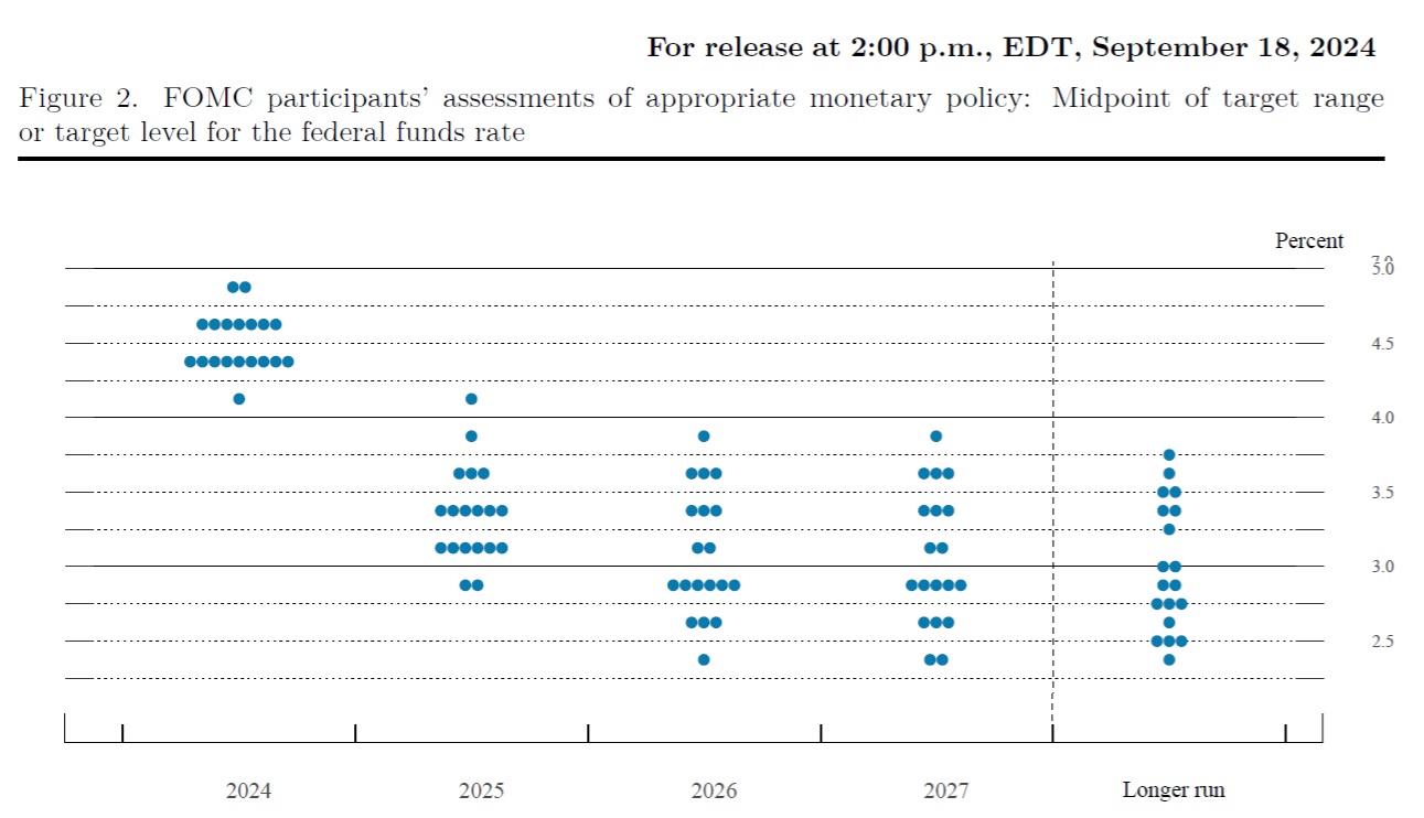 9月のFOMCでは、FOMCの経済見通し概要(Summary of Economic Projections, SEP)が発表された。その中に市場、というよりはメディアが最も注目したがる「ドット・チャート」が含まれている。今回の「ドット・チャート」はその中間予測が2024年末時点での適切な金利水準を4.4%としている。ならば、年内にあと2回の利下げを行うことになるが、それについては、ドットチャートはFOMCメンバー個々の予測値であり、FOMCがこれに縛られるものでも無く、利下げを急ぐ必要はないというのがパウエル議長のスタンスだ。つまり、昨年12月と今年の3月のドットチャートは、年内3回の利下げの可能性が示されていたが、6月は年内1回に変わった。そして今回、2回分に相当する0.50%の利下げが行われたので、もし仮に年内にあと2回の利下げをドットチャートが示唆しているのならば、6月の時は愚か、3月や昨年12月の時よりも大きめの利下げを示唆していることになるが、その背景はどういう問題と考えるべきかという疑問が当然生じる。もしくは、あと1回と読む方が正解に近いことになるのではないかということだ。その辺りについては、どのような認識が示されているかを考えてみた。まずは「ドット・チャート」自体を見て頂こう。