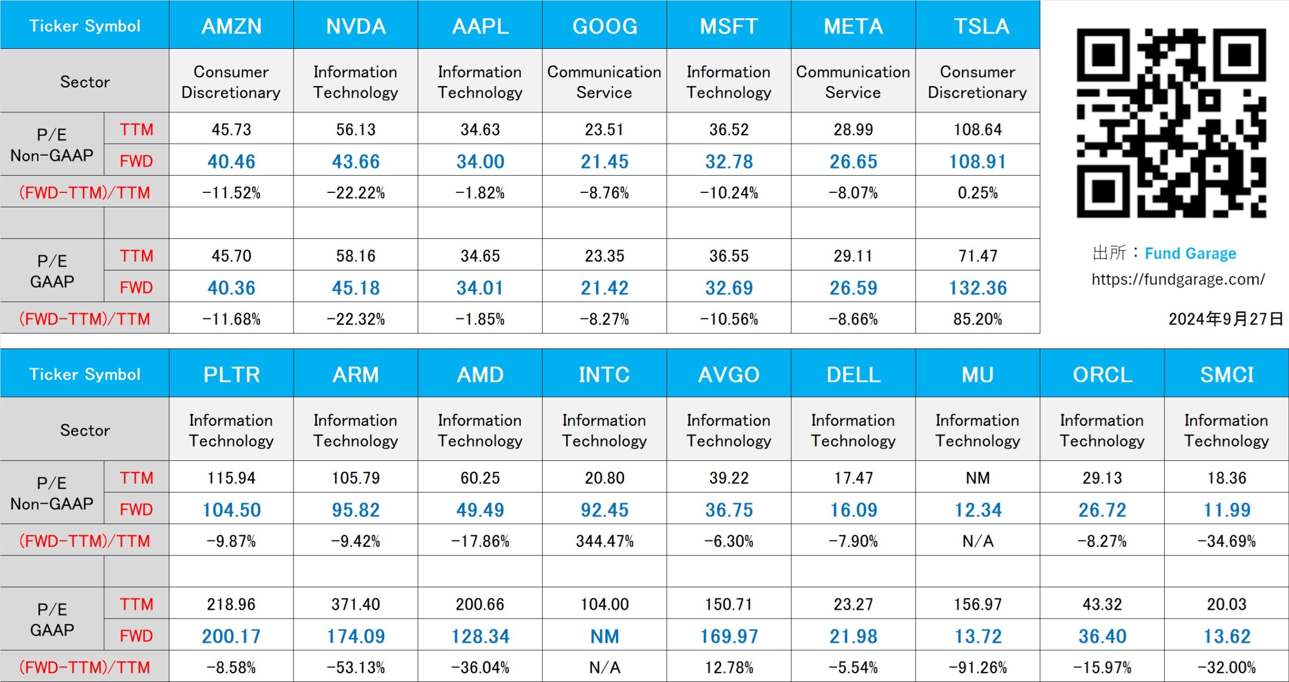 いつもの通り、最下段にPER表を掲載しておいたが、マイクロンテクノロジーの予想PERが余りにもドラマティックに低下している。間違いはないと思うが、米国のアナリストの予想データが間違っていれば、集計後の数値が間違うこともある。因みに、9月20日時点ではP/E Non-GAAP(FWD)は72.67倍だ。ただ赤字の四半期からの立ち直りである以上、増益基調で4四半期が黒字ならば、あながち有り得ない数値でもない。