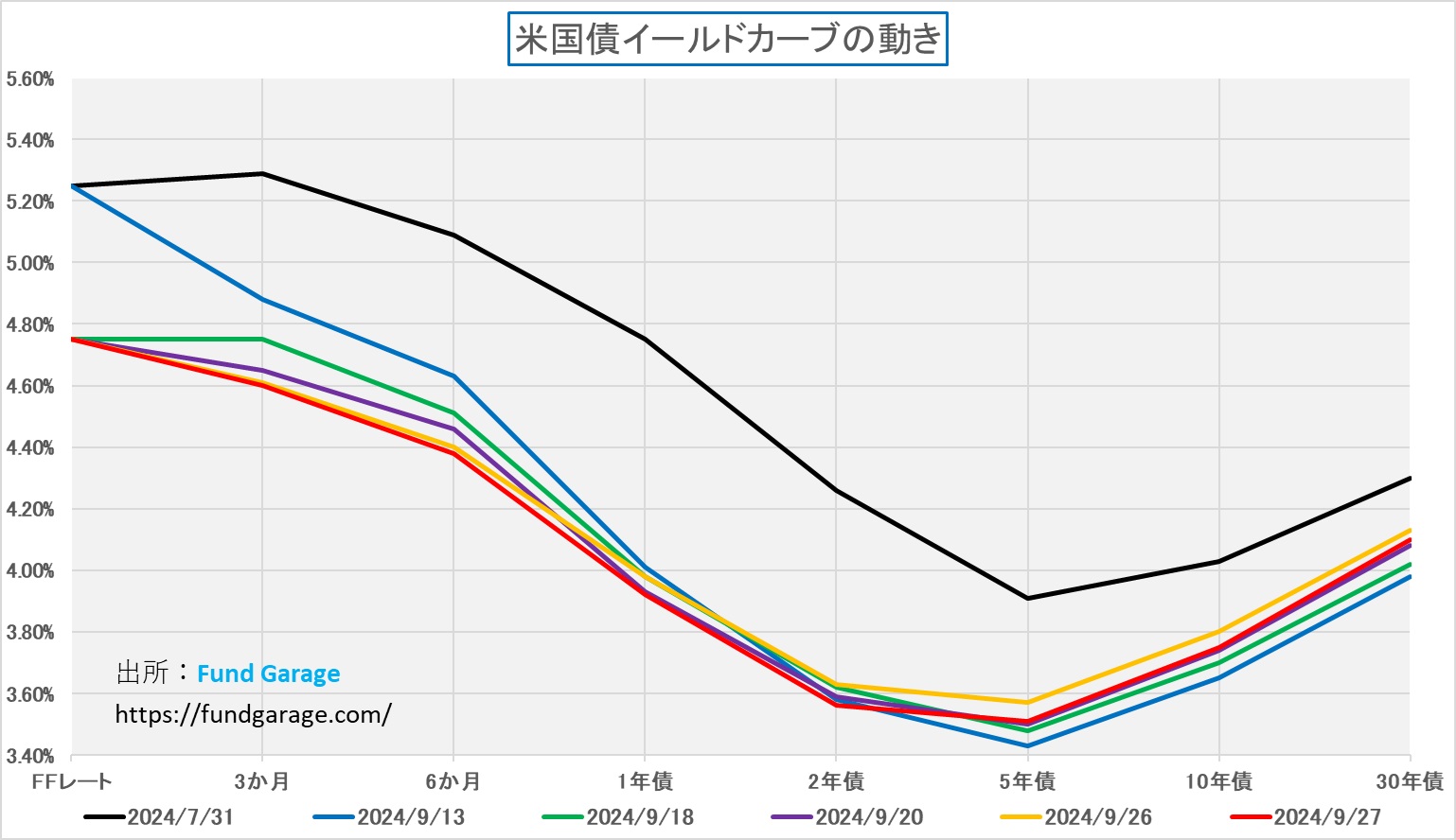 下のチャートは、7月FOMC、9月FOMCの直前の週末、9月FOMC、その週末、そして26日と27日だ。ご覧頂ける通り、7月のFOMCの時の水準まで戻れば、順イールドになるのはそう遠くない。アメリカ景気は強いというのだから、そうなっても不合理ではない。そうなれば、日米金利差拡大から、再び円安にもなるだろう。