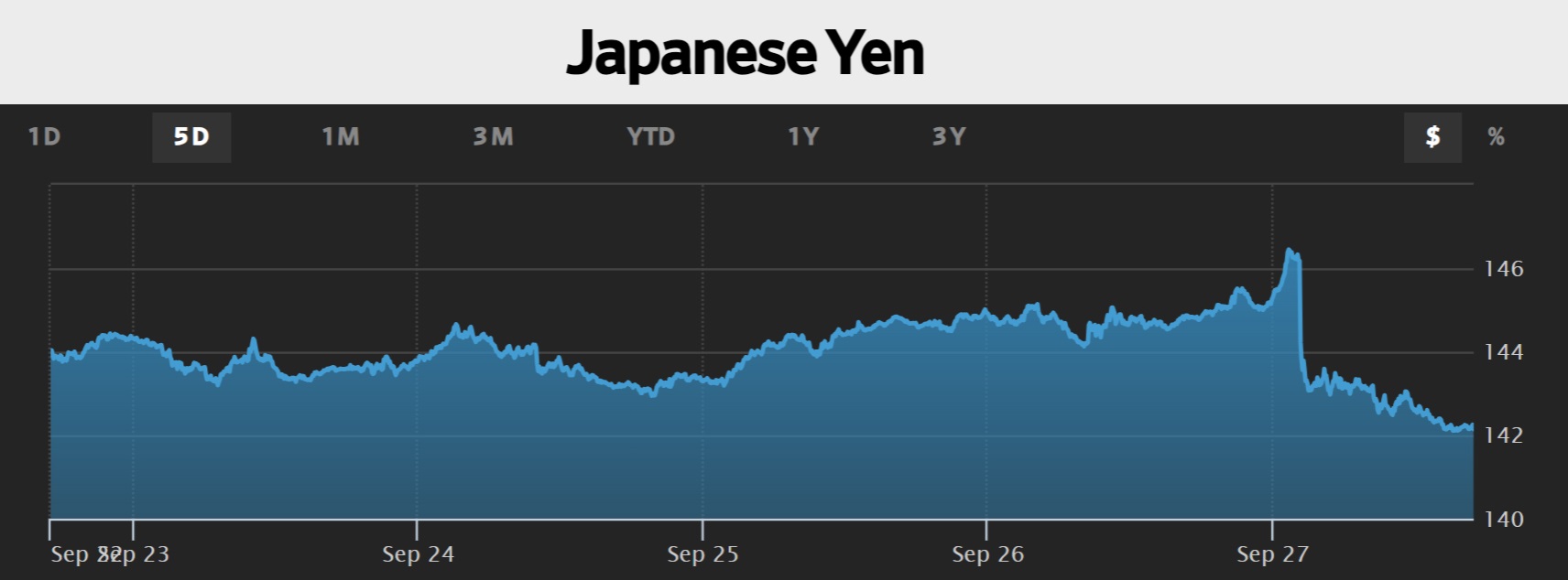もしこの流れを見て、「日本株は売られたけれど、日本円という通貨は買われたんだから、市場は石破新総裁誕生を喜んだ(高く評価した)」などと仮に考える方が居たとしたら(メディアはそう言い兼ねないが・・・)、それはきっちりと「何が起きたのか」と状況を整理して考え直すべきだろう。その為には株式市場の動きについても同様だが、この一週間の市場の動きとその背景をきっちりと振り返らないとならない。因みに週末のドル円相場の終値は142円21銭、前週末の終値は143円85銭となっているので、これまた二点間の比較では大した変動では無いと思われるかも知れない。だが、まさにこれがポイントで、日経平均株価が金曜日の後場に急伸した理由は、為替が146円台を超えて円安になったことが背景にある。まずは為替の5日間の推移チャートを見て頂こう。このチャートの日付の振り方は米国時間になっているので、若干ズレているが、ご覧頂ける通り、146円を超える円安で146円22銭まで円安が急激に進んだ後、一気に円高に押し戻されたことが一目瞭然となっている。取分け、日本時間を終わってからの動きは一貫して「円高」であることに、注目したい。