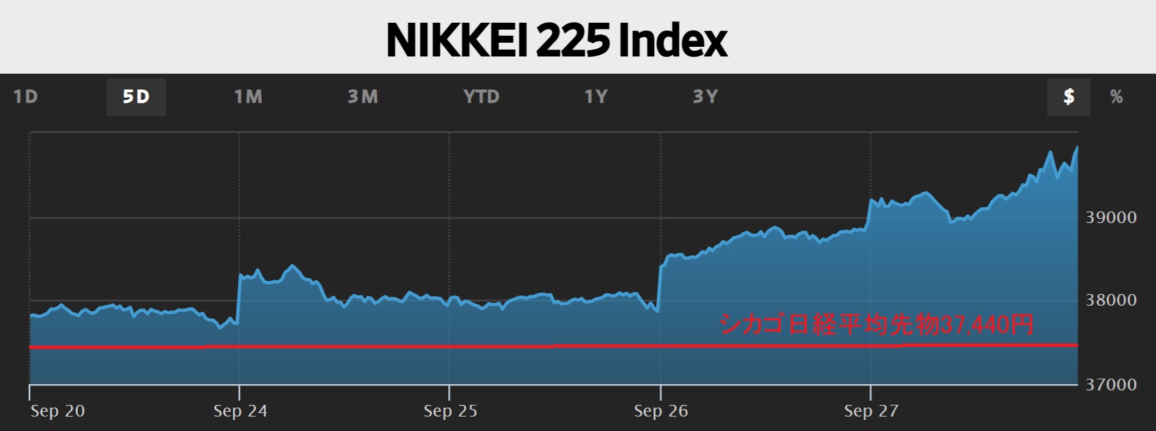 対比し易いように、同じフォーマットで日経平均株価の先週一週間の株価運びもご覧頂こう。こちらは当然、日本時間で目盛があるので、多少のズレがあることにはご留意頂きたい。時系列で言えば、このチャートの右側以降に、石破新総裁となったことが報じられ、急激な円高と、日経平均先物の崩落が始まっている。赤い線の水準が先週末のシカゴ日経平均先物の終値37,440円を示している。