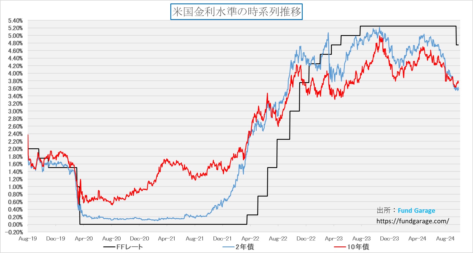 ならば、なぜ今夏7月初旬に日経平均株価が最高値42,224円02銭(7月11日)をつけ、ドル円相場が161円70銭(7月10日)もの円安となったのか。一般的には(アベノミクスへの批判も含めて)日銀の異次元金融緩和政策の賜物と言われている。日銀が超低金利を維持してきたからこそ、日米の金利差が拡大し、それによって「円キャリー取引」が膨らみ、「円売りドル買い」と、円安効果による輸出企業の収益向上と、その調達した日本円の投資先として日本株が買われたといったお決まりのストーリーそれだ。だが、下のチャートで示す通り、米国のパンデミック後の利上げ開始は2022年3月17日の0.25%が始まりであり、最後は2023年7月26日に行われた0.25%の利上げだ。米国債券市場が決定する米国債10年債利回りは、FRBによる最後の利上げから3カ月後の2023年10月25日に最高値4.95%をつけて、足許では3.75%まで低下している。因みに、2年債利回りは10年債に先んじること2023年10月18日に最高値5.22%をつけている。