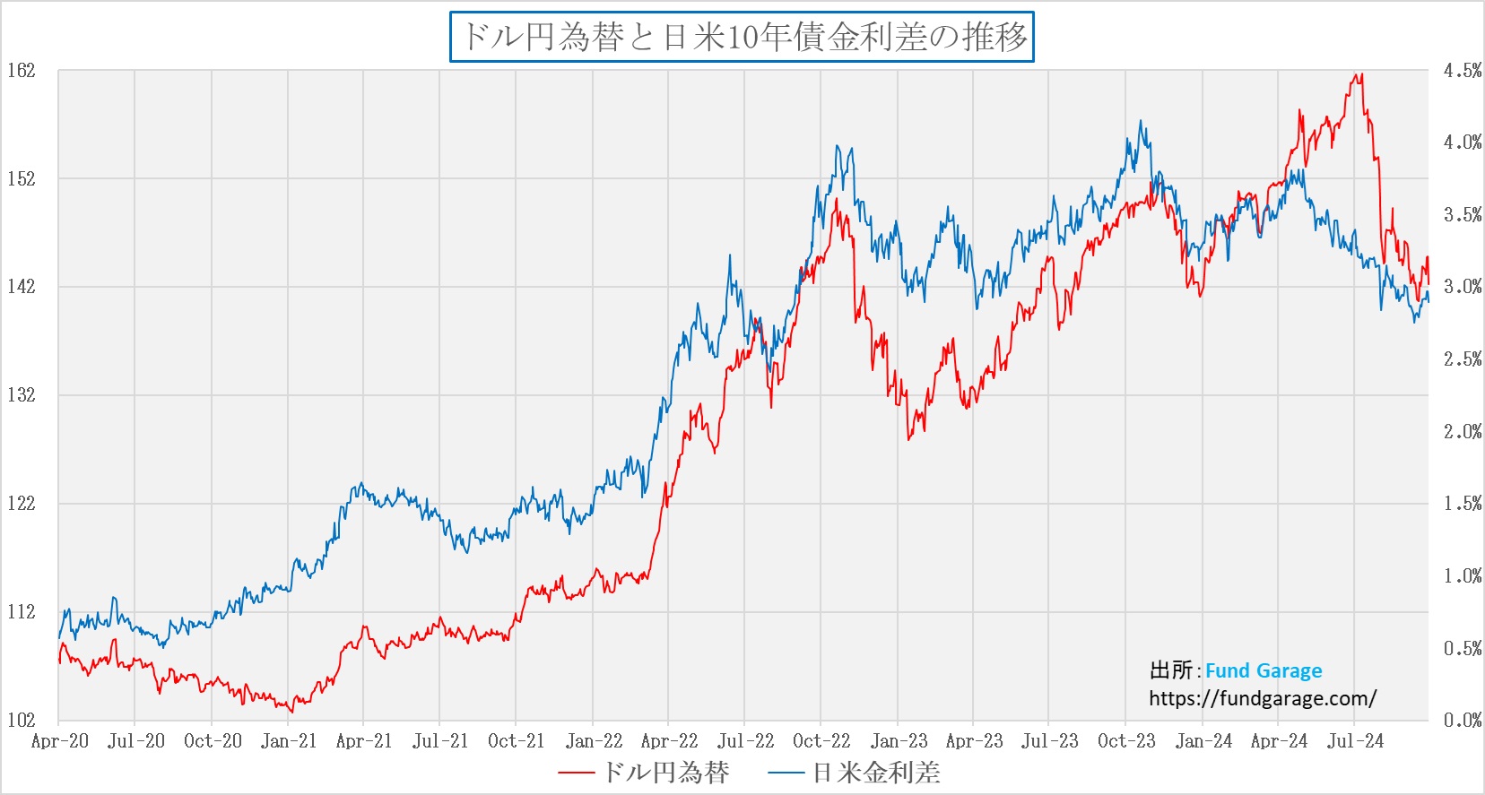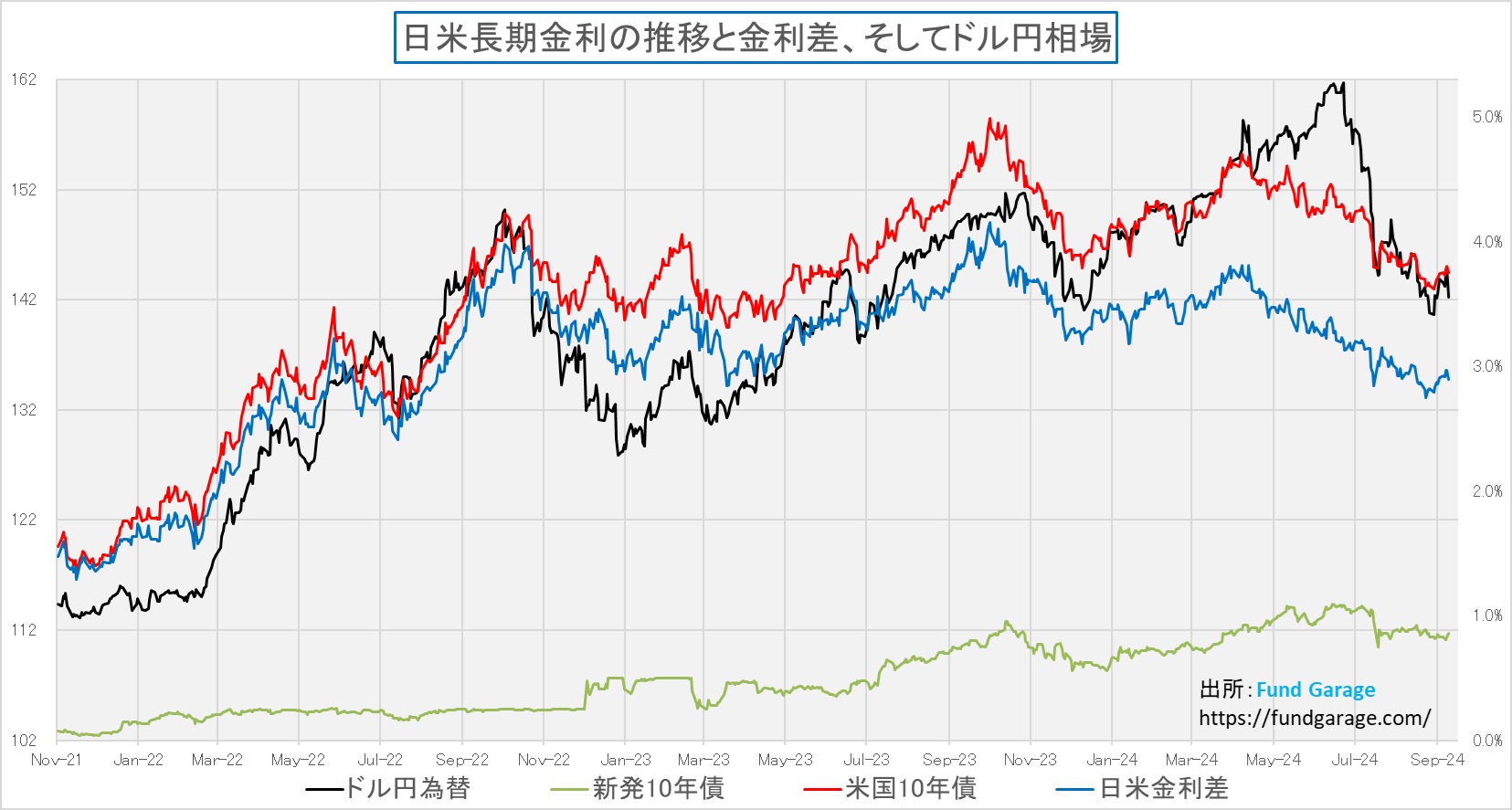 下のチャートには、最下段に緑の線で日本の長期金利である10年債利回りが描いてある。これが所謂「YCCの対象」となるものだが、2023年7月27日~28日に行われた日銀金融政策決定会合で、10年物国債の利回り上限を1.0%に実質的に引き上げ、柔軟性を持たせた形での運用が開始されている筈だが、その決定以降で1%を超えたのは2024年5月22日が最初で、8月2日以降は一度もないことがわかる。従って、長期金利の金利差についても、2023年10月19日の4.150%をピークに、基本的にはなだらかな下降トレンドで縮小が続いている。足許の金利差で言えば3%を割り込んでいる。つまり、かなり大雑把に纏めると、ドル円相場は日米の長期金利の利回り格差に基本的には収斂する性質があるということになるようだ。