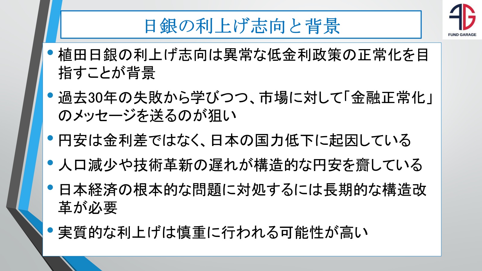 そのヒントは、前回の日銀金融政策決定会合後の記者会見にあったと思っている。実は私なりに納得出来る「なぜ今、日銀は利上げ志向という立場を見せているのか」という背景を再度整理してみたのだが、結論としては「利上げ志向というのは単なるブラフである可能性を排除出来ず、実質的な利上げは慎重に行われる可能性が高い」というのが私の結論だ。その整理をスライドにして見たので、以下にご紹介する。